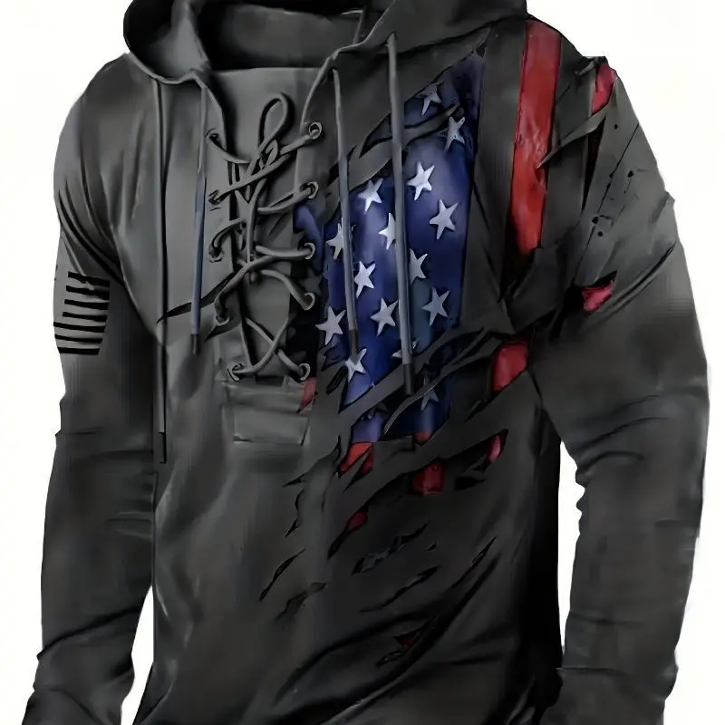 1pc Men'S Plus Size Casual Hoodie with American Flag Print, Vintage-Inspired Geometric Pattern, Polyester Knit Fabric with Slight Stretch, Regular Fit Hooded Sweatshirt country concert outfit clearance deals today