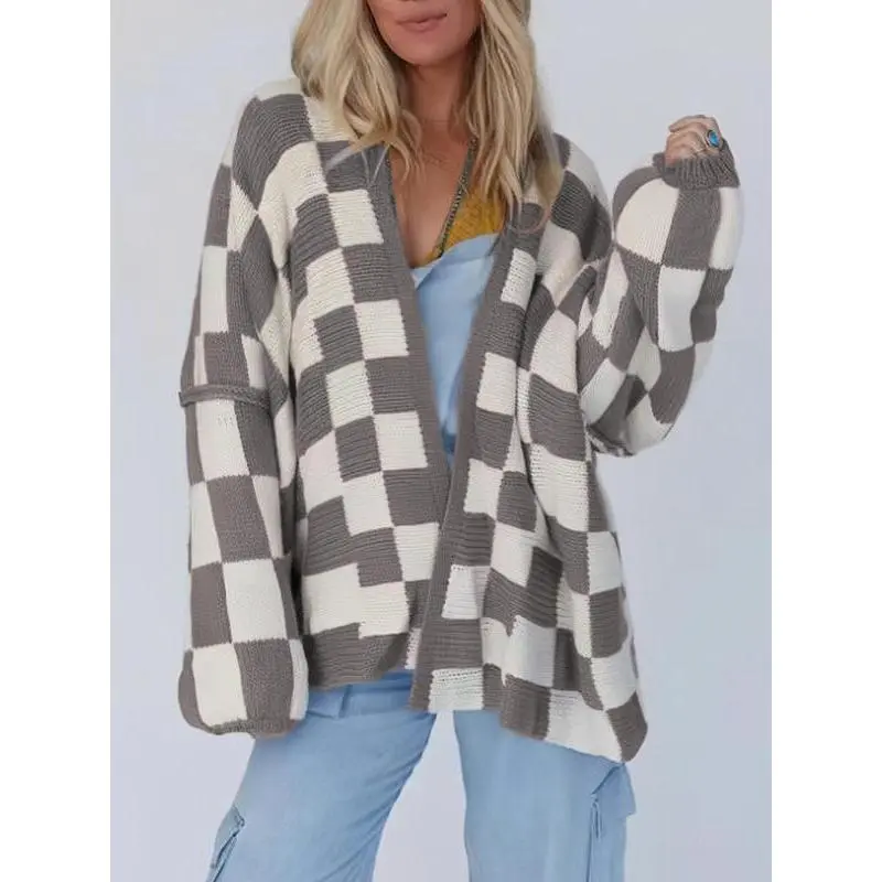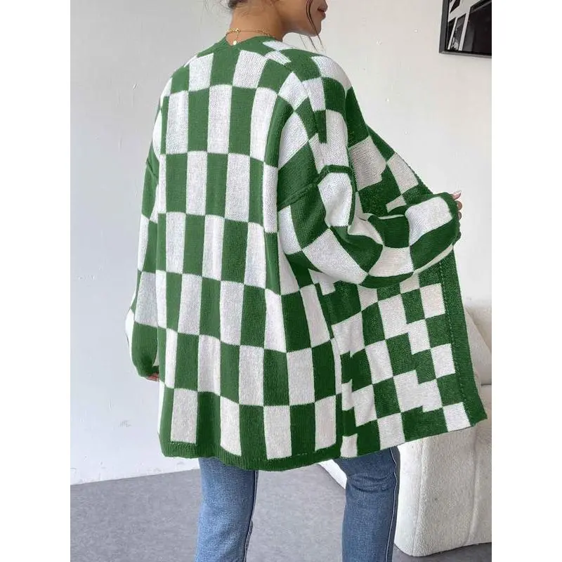 Christmas Deals Women's Checkerboard Pattern Drop Shoulder Cardigan, Casual Long Sleeve Open Front Knitwear for Summer, Fashion Ladies' Knit Clothing for Daily Wear, Christmas 2024 Trend, Fall&winter Clothing
