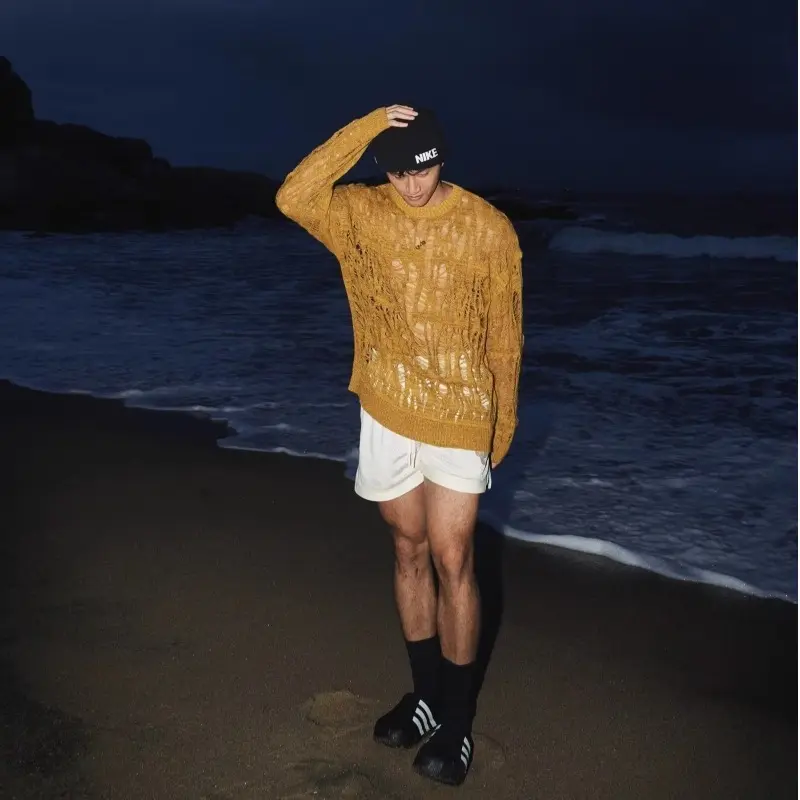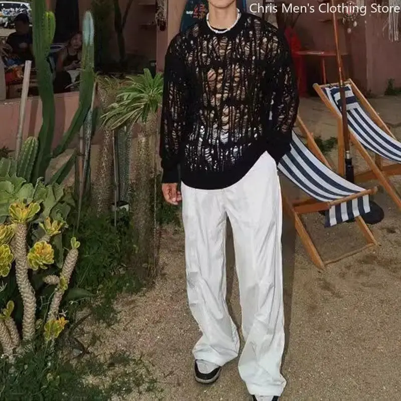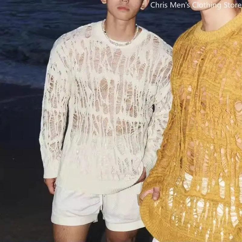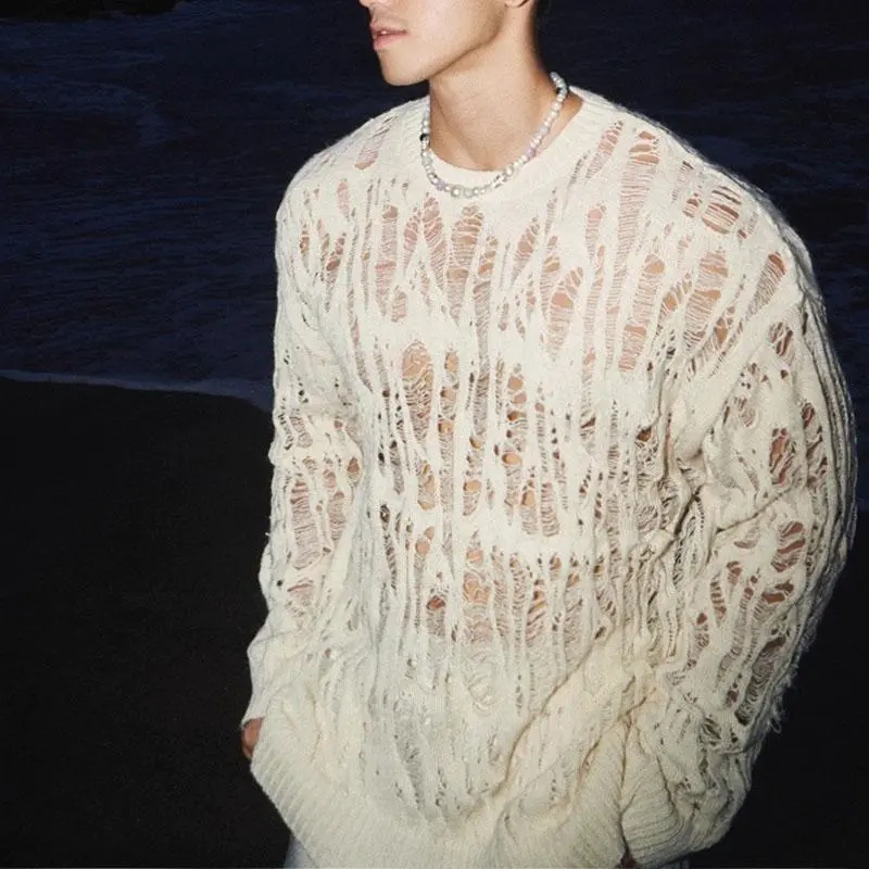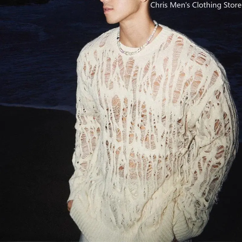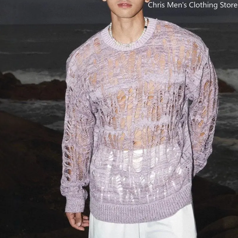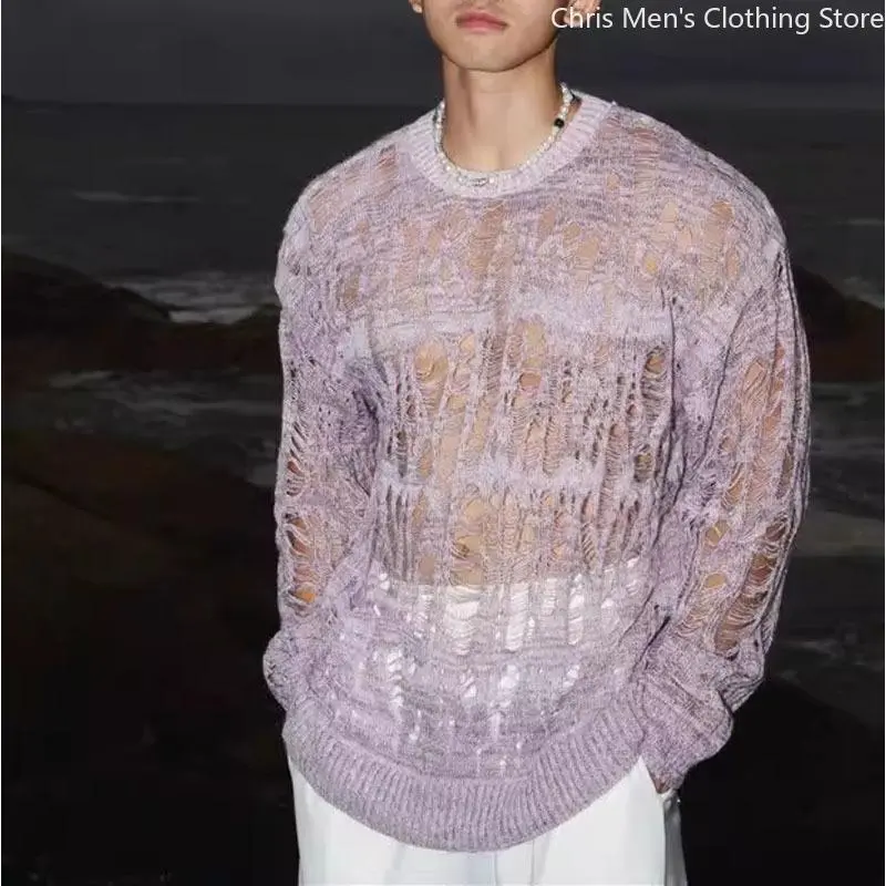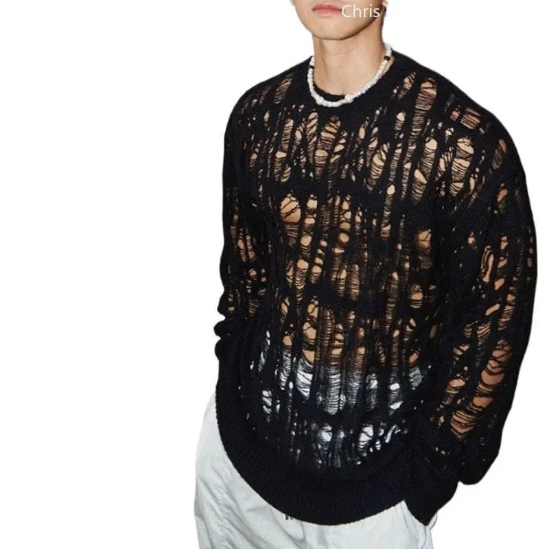 SexyHollowQutMeshKnitTShirtsMenSeeThroughRippedCrewNeekPulloverTops Knitwear Menswear