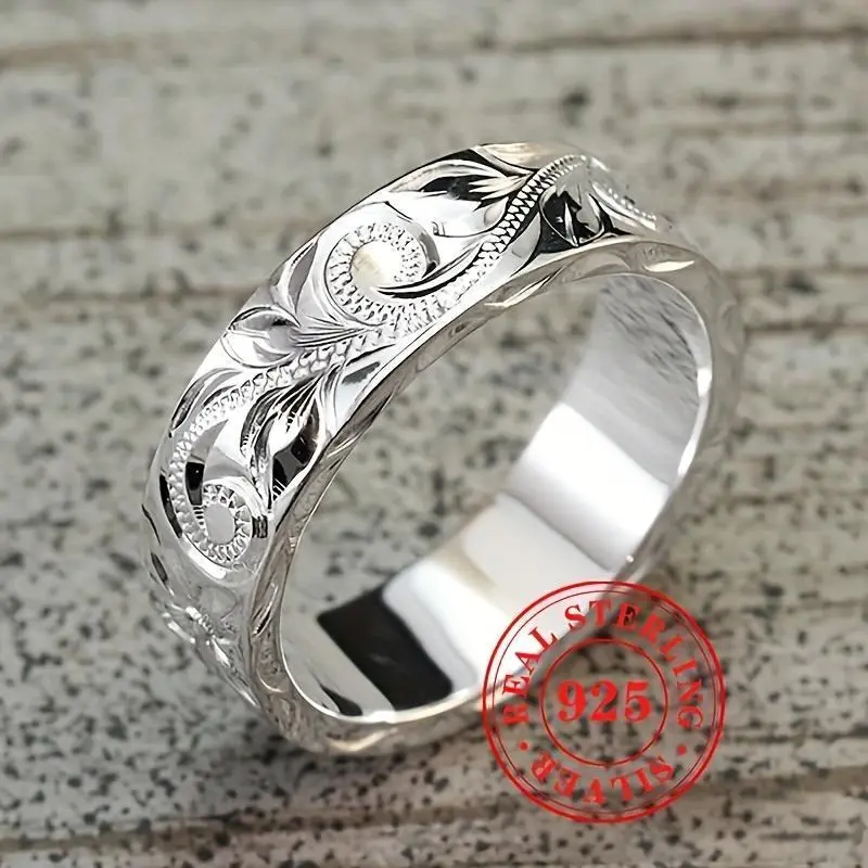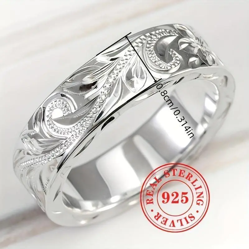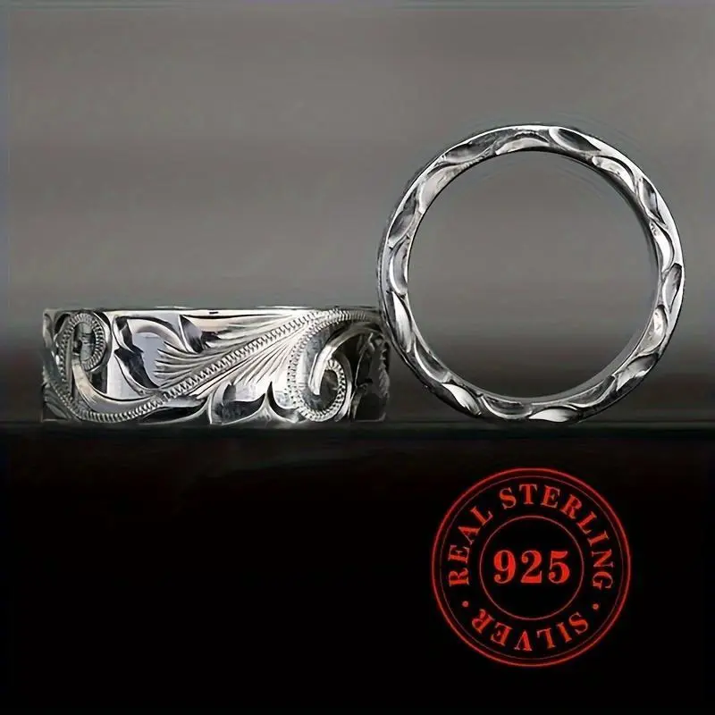Elegant 925 Sterling Silver Wide Band Ring with Bohemian Leaf and Flower Carvings, Vintage-Inspired Design - Ideal for Special Occasions, Artisan Crafted, Carved, Retro Style