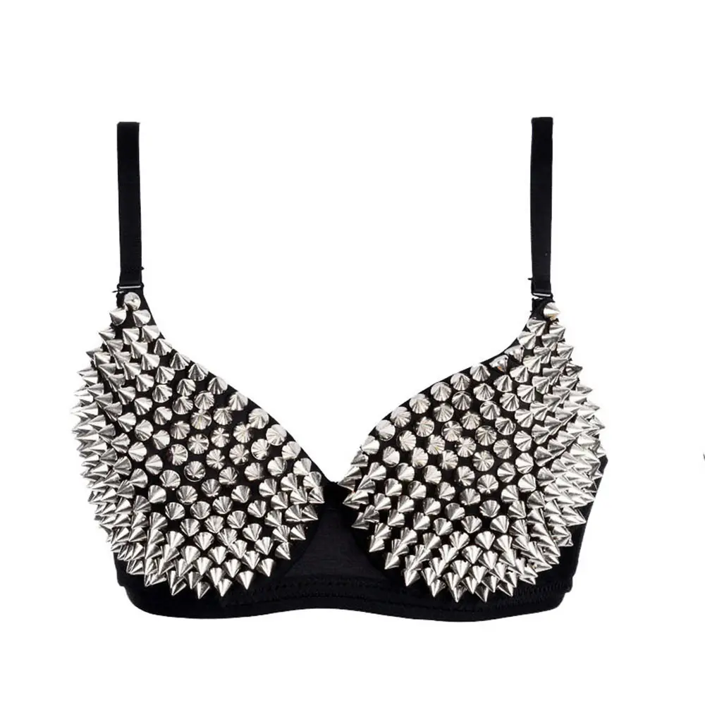 Silver Punk Push Up Bra with Spike Rivets, Women's Edgy Corset Top for Clubwear, Dance Performance & Gothic Lingerie, Comfortable Fashion Bustier for Daily Wear