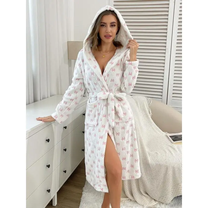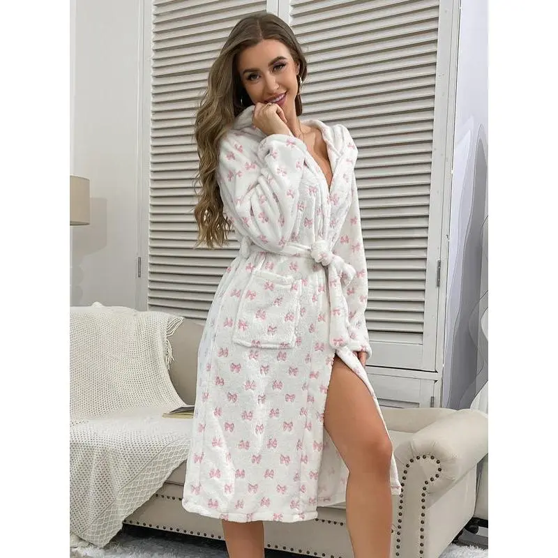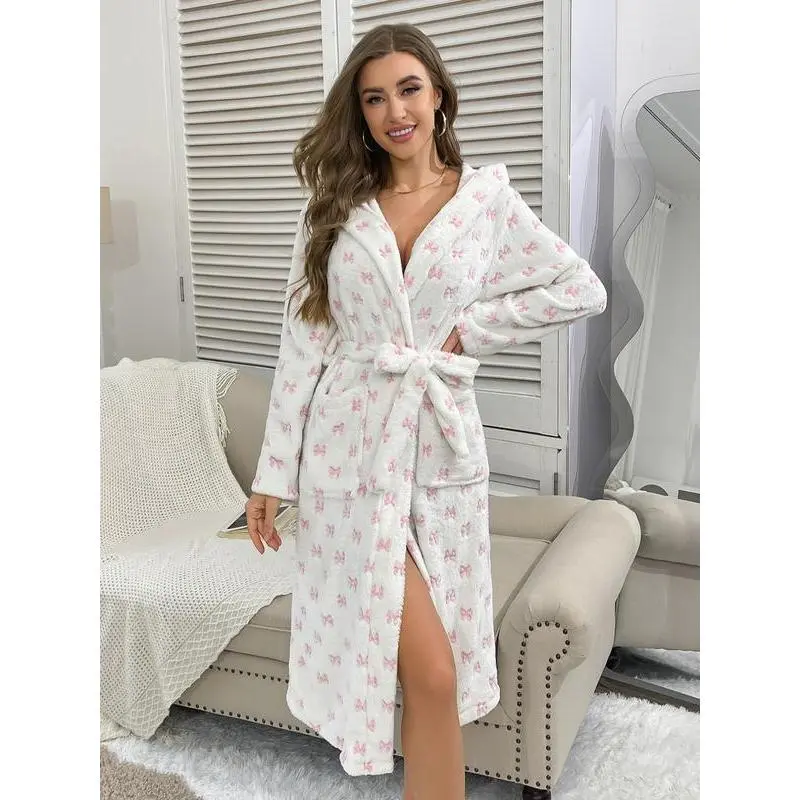Women'sfullbodybutterflyknotnightgown,softandcomfortable,withsmallpocketsonbothsides.Samestylewaistbelt,plushhood,thickrobe.Autumnandwinterstyles,plushwarmhomeclothes,outdoorcasualpajamas