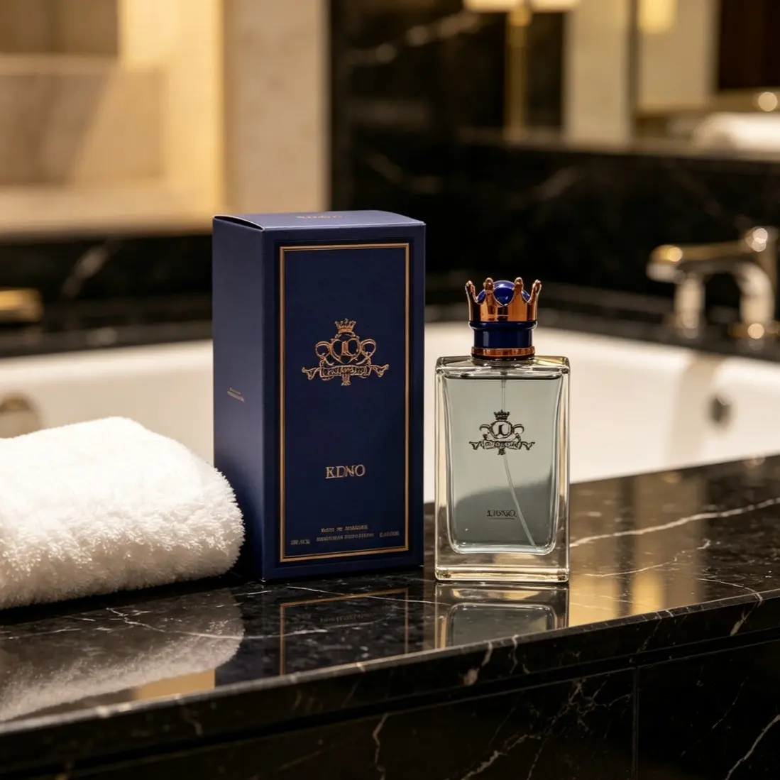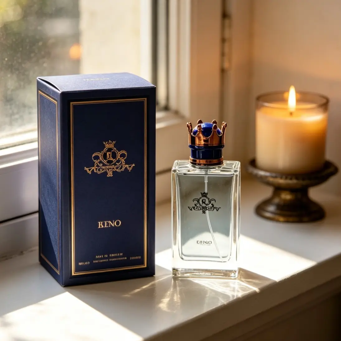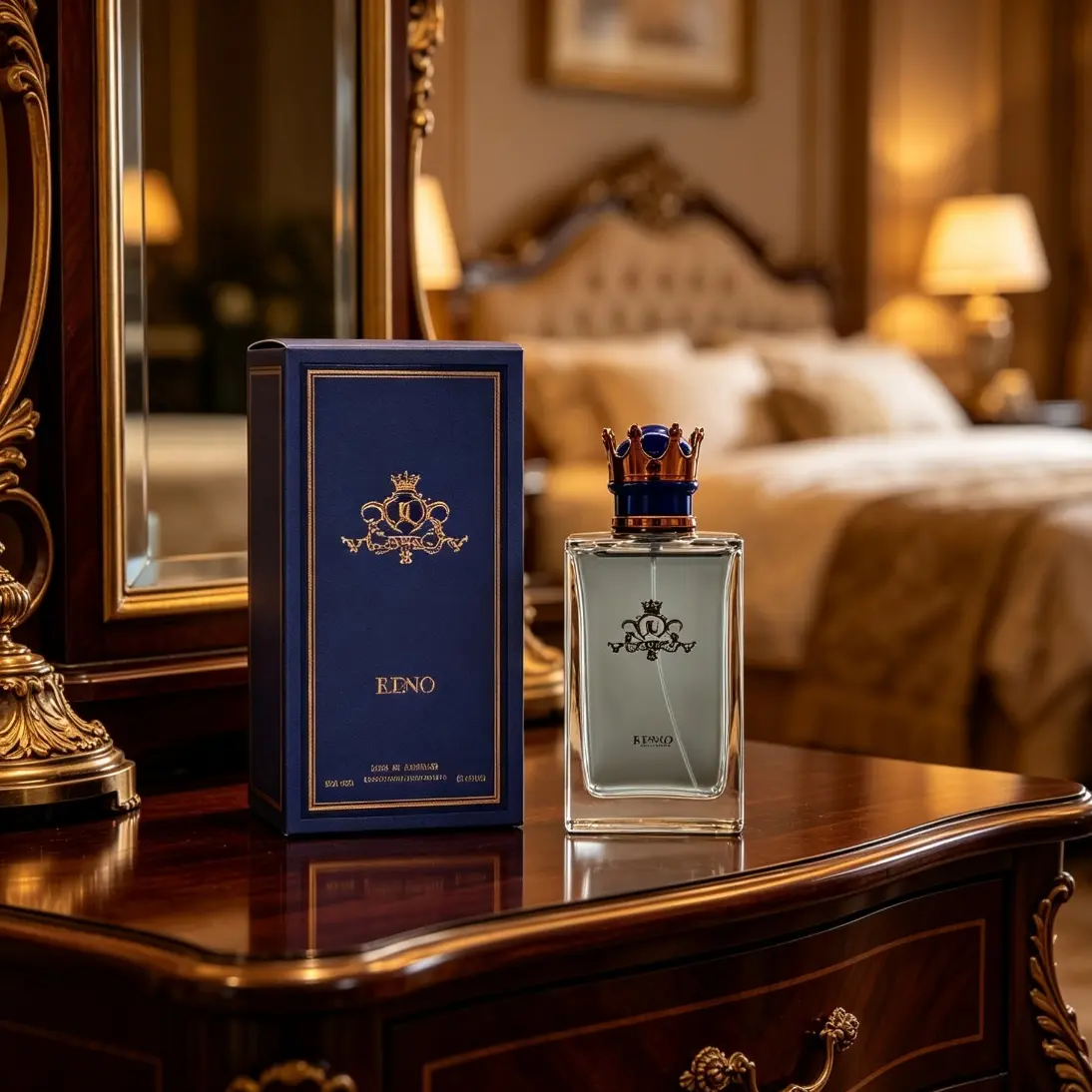 The signature royal crown cap, paired with a sleek square glass bottle and deep navy luxury packaging, isn't just a fragrance—it's a statement piece for your vanity, perfect for gifting or personal collection.