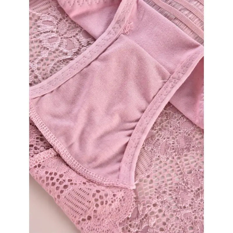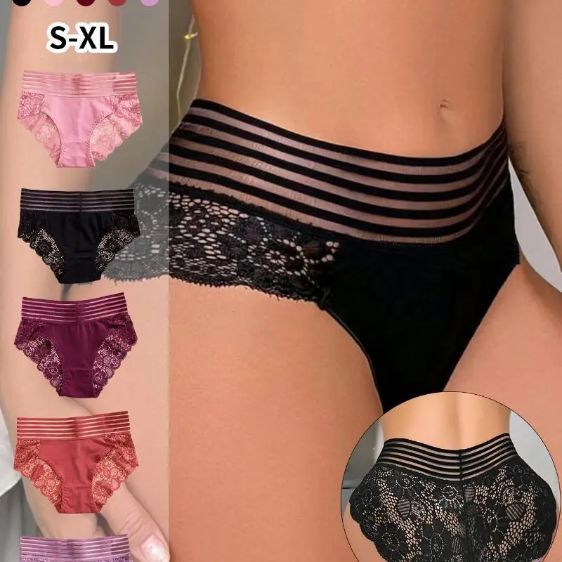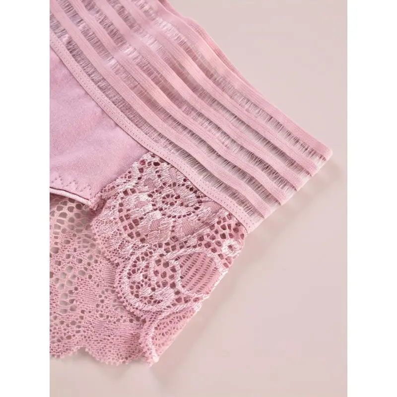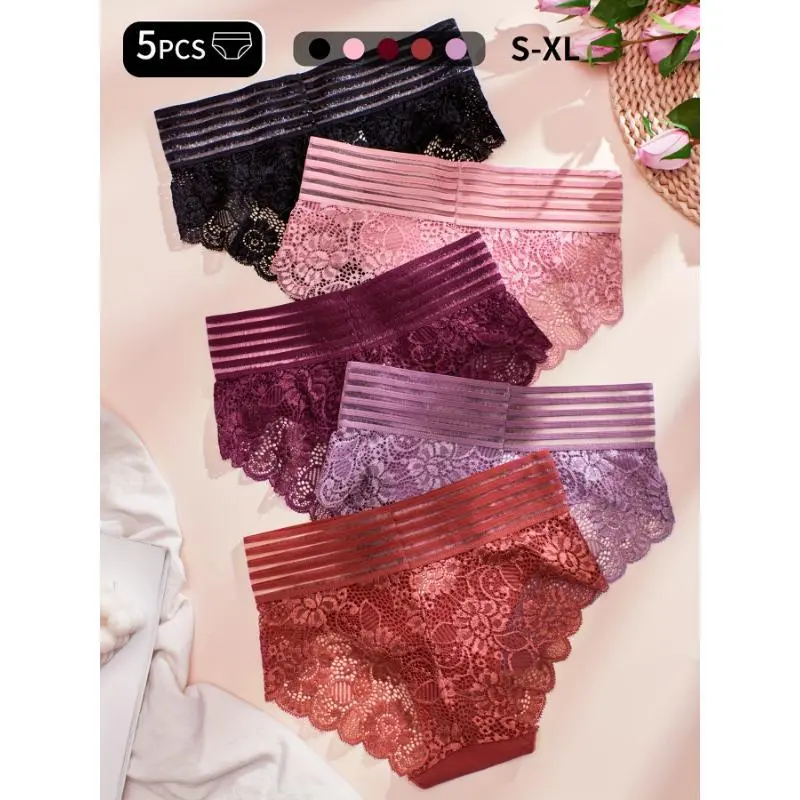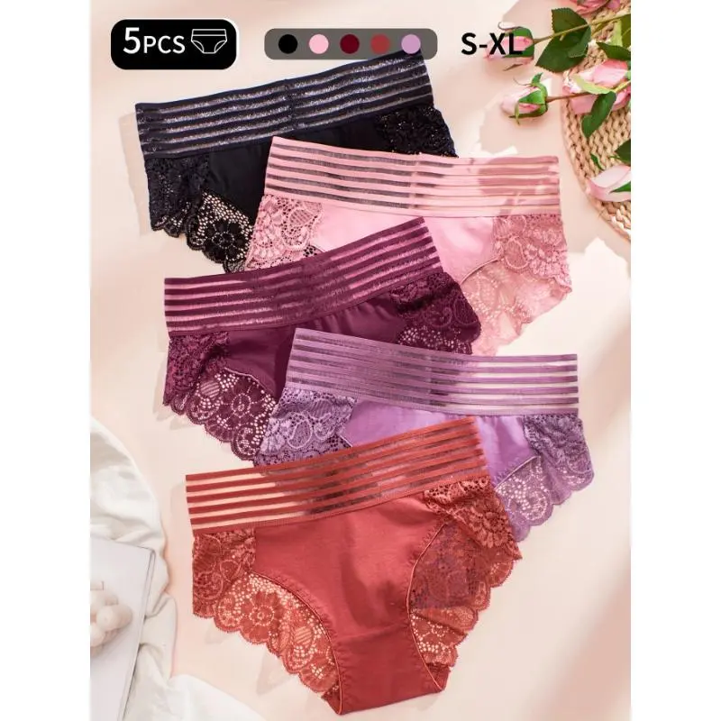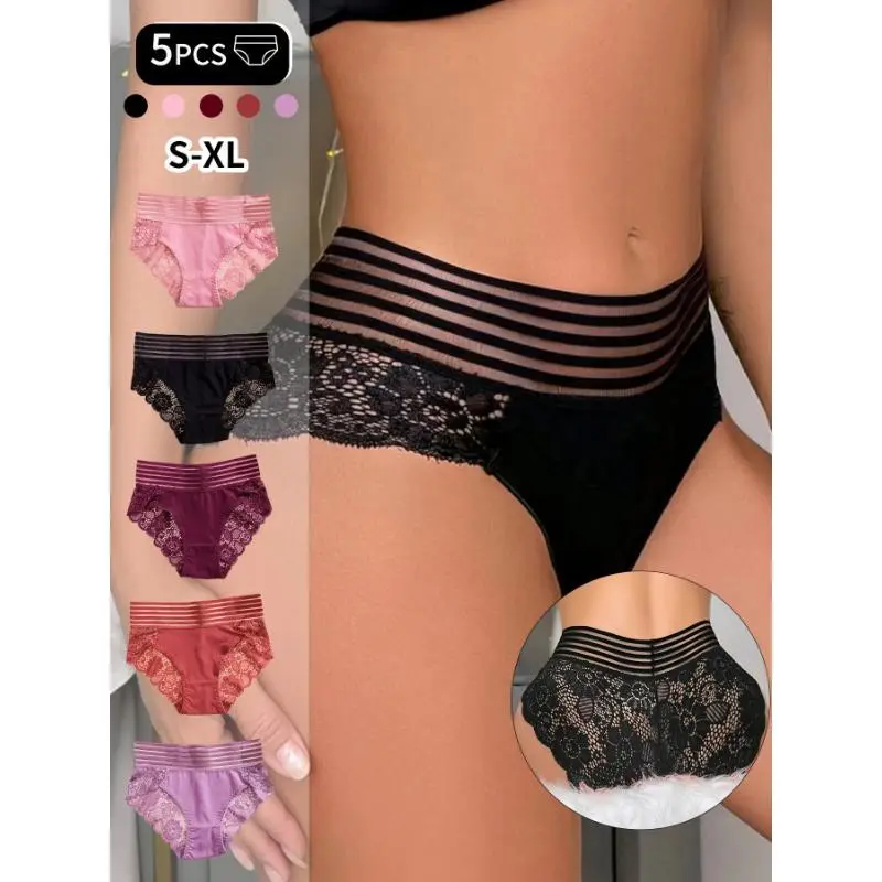 5pcs Striped Lace Stitching Briefs, Soft & Comfy Stretchy Intimates Panties, Women's Lingerie & Underwear Breathable Knicker Floral