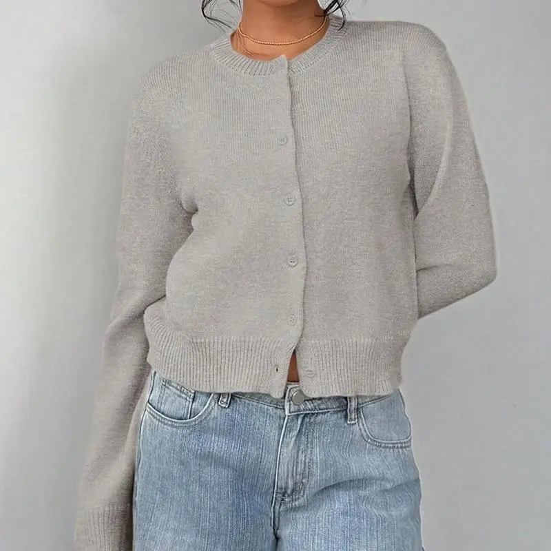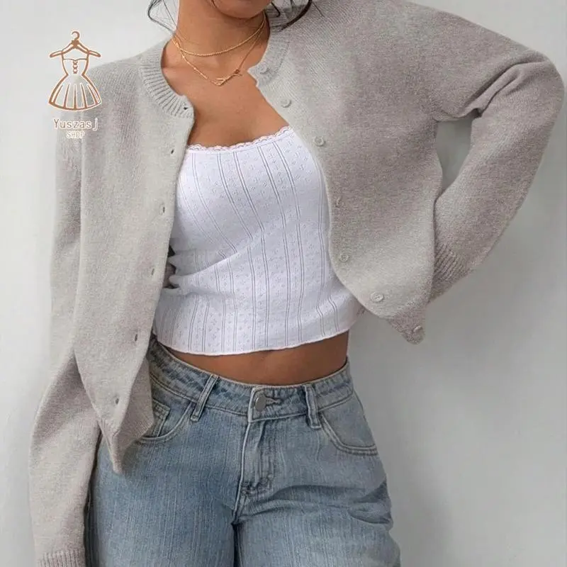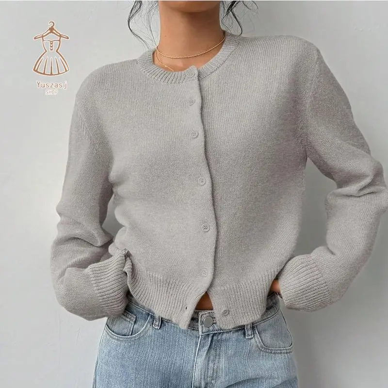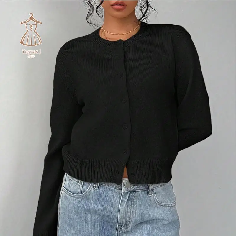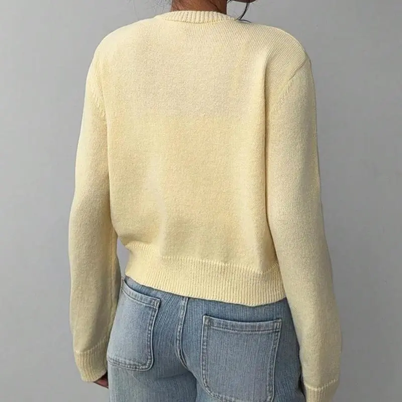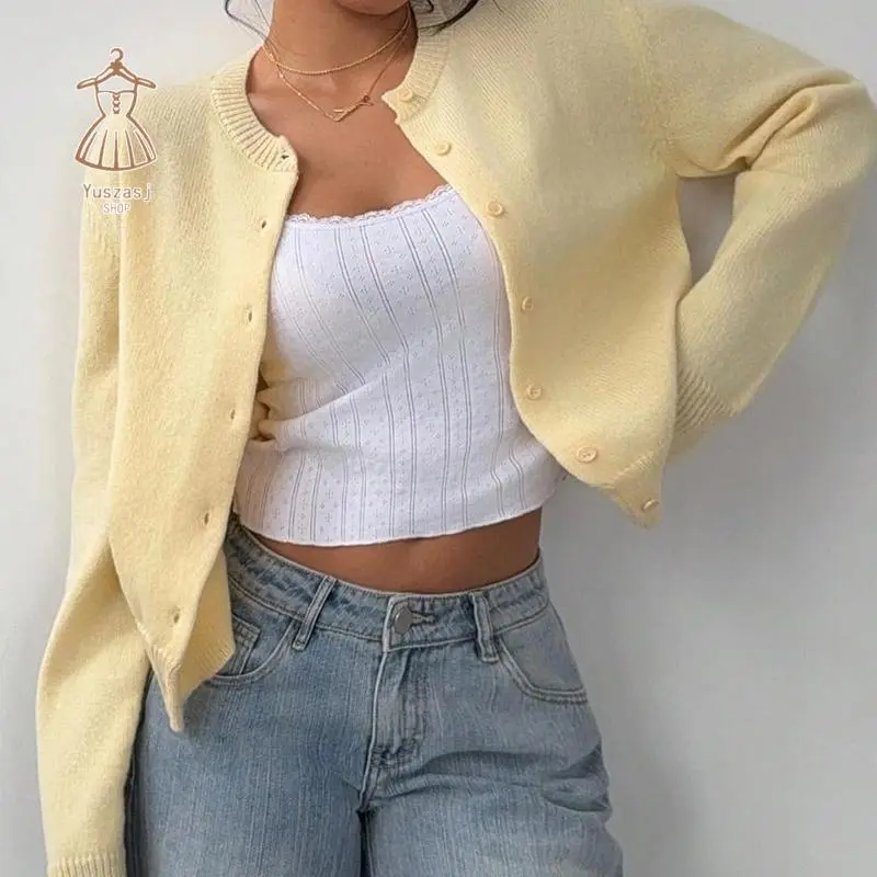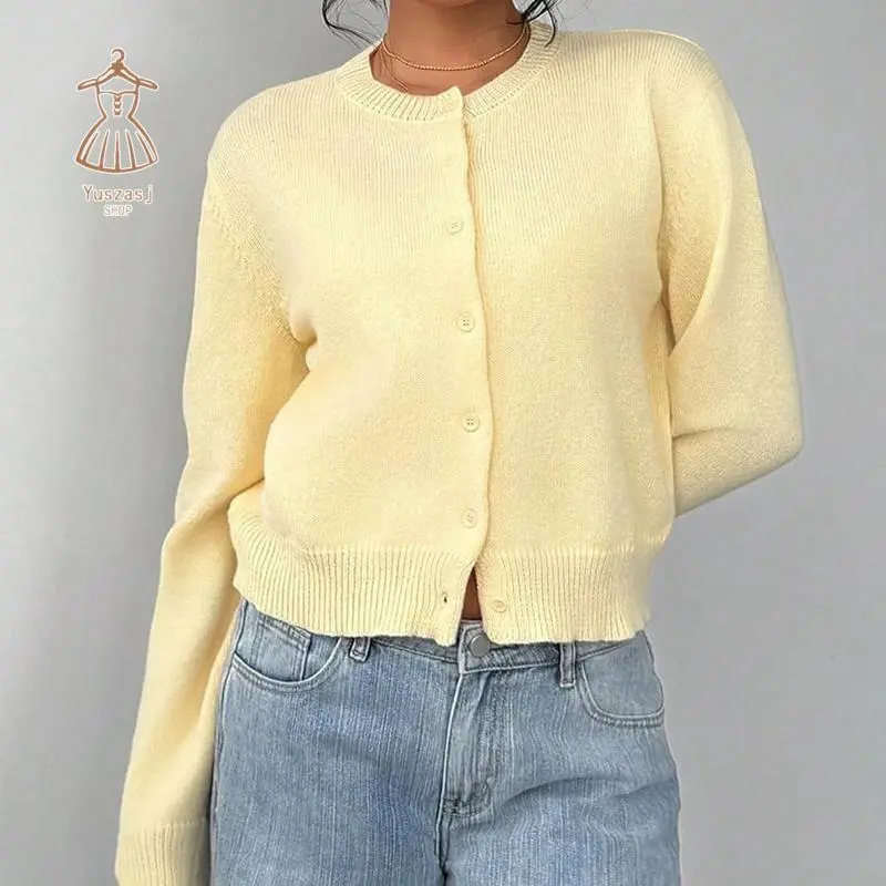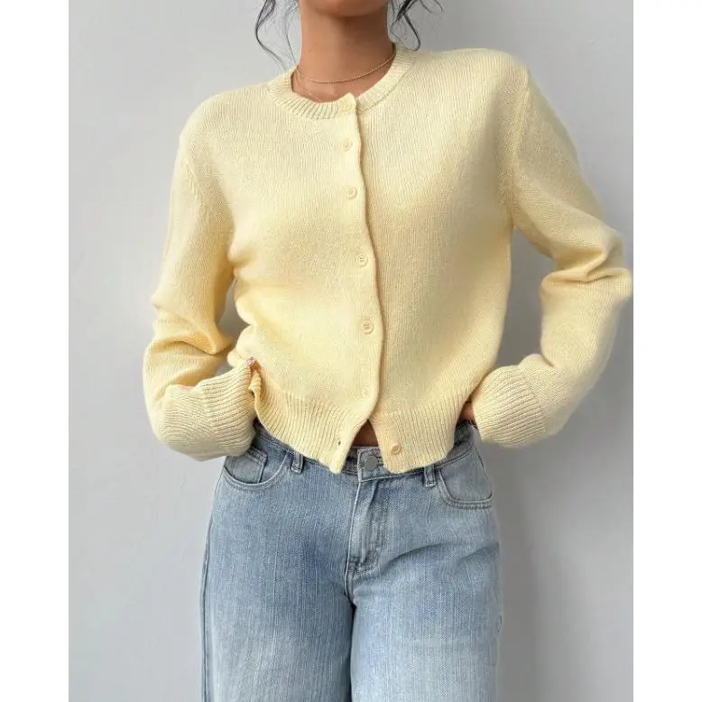 Women'sSpringandAutumnFreshLightYellowRoundNeckShortKnittedCardigan,SingleRowButtonSuperVersatile