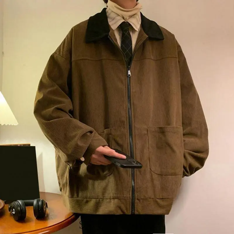 Corduroy Men American Style Vintage Windbreakers Zipper Coats Autumn Loose Cargo Outwear Casual Clothes jacket