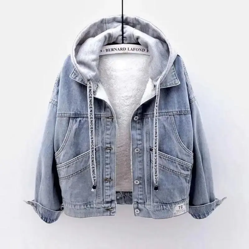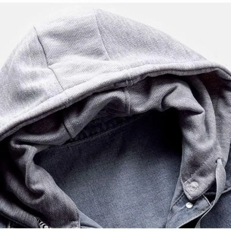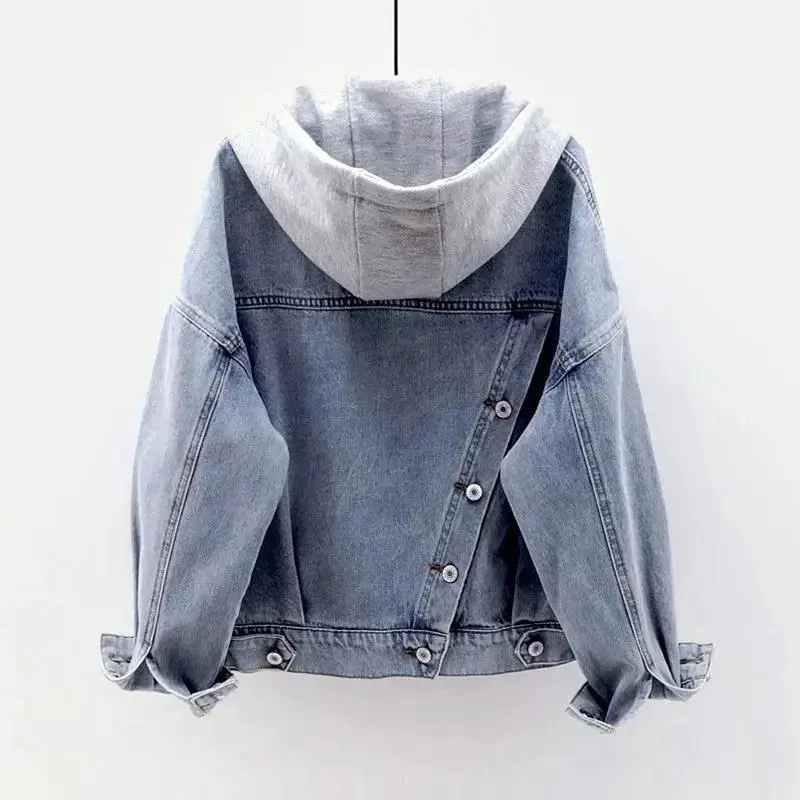 Blue Deconstructable Hooded Turn-down Collar Denim Jacket Women Loose Button Patchwork Outwear Jean Coat Female Outerwear Casual Basic Long Sleeve