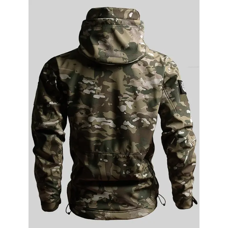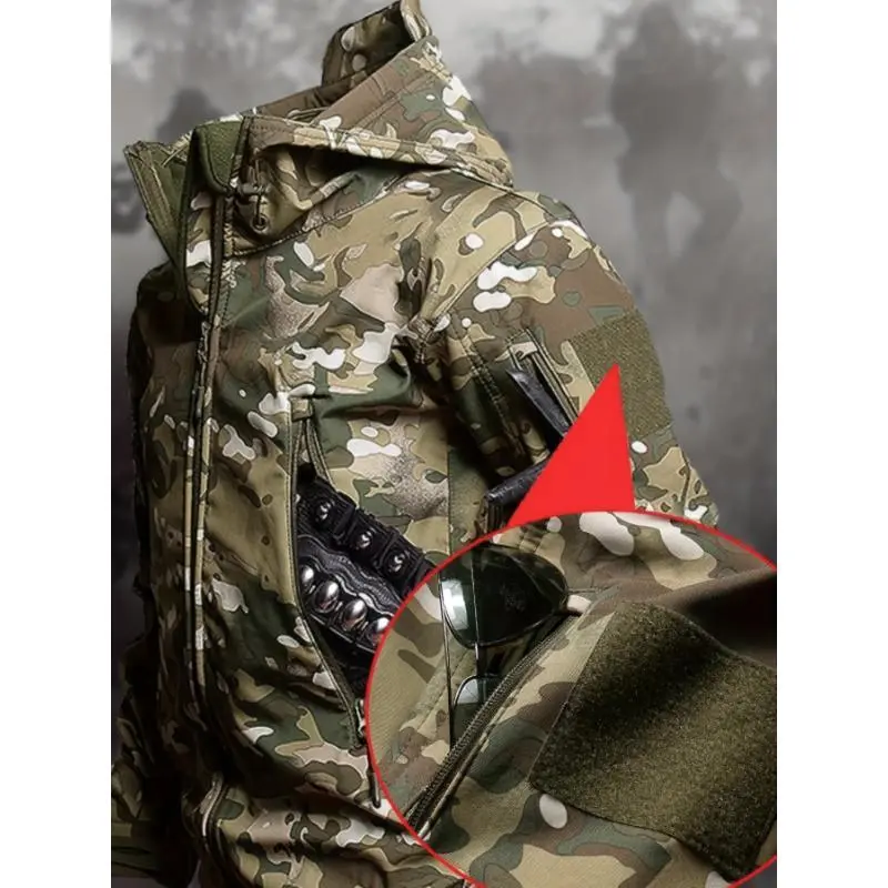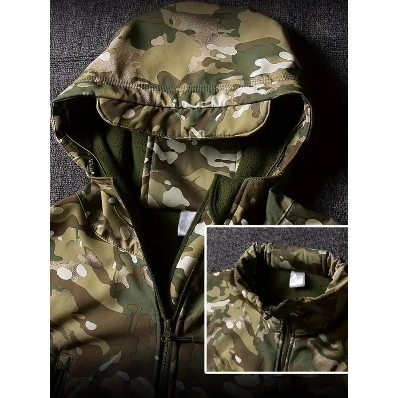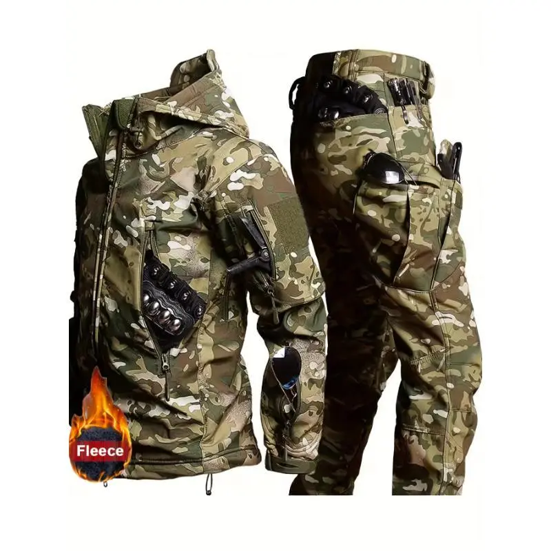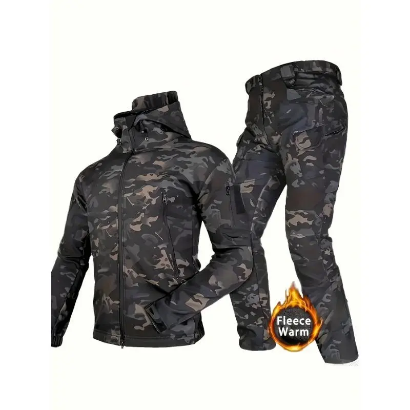 Camouflage Shark 2pcs Set Men's Outdoor Fleece-lined Warm Jacket Soft Shell Jacket Multi-pocket Wear-resistant Work Pants Suit Thickened Winter Suit Without Accessories
