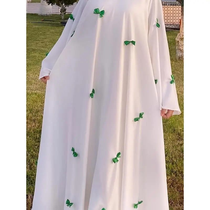 Elevate your wardrobe with this elegant white abaya, designed for women who appreciate a blend of style and comfort.This maxi kaftan dress features:/Elegant Design: The white abaya showcases a beautiful white color with a striking blue butterfly bow detail, adding a touch of elegance and sophistication./Bell Sleeves: The bell sleeves provide a stylish and feminine touch, enhancing the overall aesthetic of the dress./Full-Length Robe Style: The full-length robe style offers a chic and versatile look, perfect for various occasions./Material: Crafted from durable polyester, this dress is designed for spring and fall wear, ensuring it remains a staple in your wardrobe throughout the year./This maxi kaftan dress is a versatile addition to your collection, perfect for any occasion.