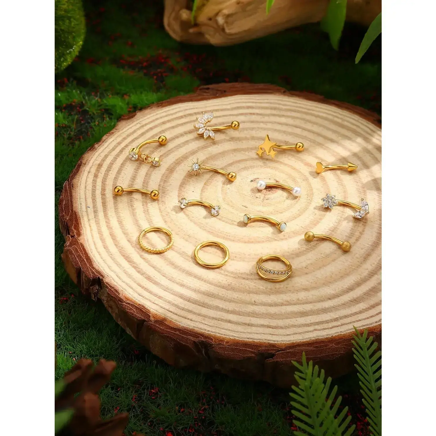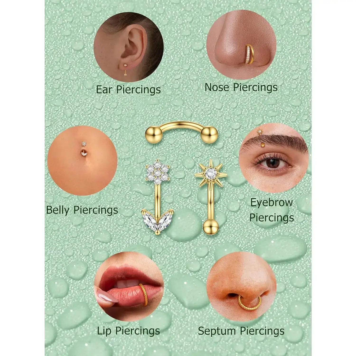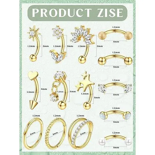 1. Rook Piercing Jewelry Set: This rook earrings for women set consists of 11pcs 16g curved eyebrow piercing jewelry and 3pcs cartilage hoop piercing in different styles, which are designed with flowers, heart, snake eyes, frog eyes. Feel free to match your style 2. Hypoallergenic Piercing: These surgical steel rook piercing jewelry are carefully crafted from genuine premium materials to ensure irritation-free wear, with a nickel free and lead free composition. Newly upgraded vacuum 14K gold-plated plated process makes these vertical labret lip jewelry waterproof, no rust and non tarnish. 5A+ cubic zirconia inlaid, and 4 prong claws ensure the gemstones stay securely, long-lasting shine 3. Rook Jewelry Size: 16g(1.2mm), wearable bar length 5/16"(8mm). Diameter of both screw backs: 3mm, upgraded double ends screw design is easy to screw on and take off. Rook hoop earrings inner diameter: 8mm, classic round hinged segment hoops design, easier to put on or take off 4. Earring Sets for Multiple Piercing: These curved barbell piercing jewelry are not just for rook earring, versatile design suitable for other various piercings, including daith piercing jewelry, eyebrow piercing jewelry, vertical labret lip piercing jewelry, surface tragus piercing jewelry, cartilage earrings for women, conch piercing jewelry hoop, double helix piercing jewelry, nose rings hoops, septum nose rings for women, belly button ring and more body piercing jewelry