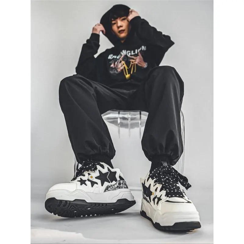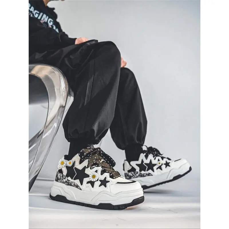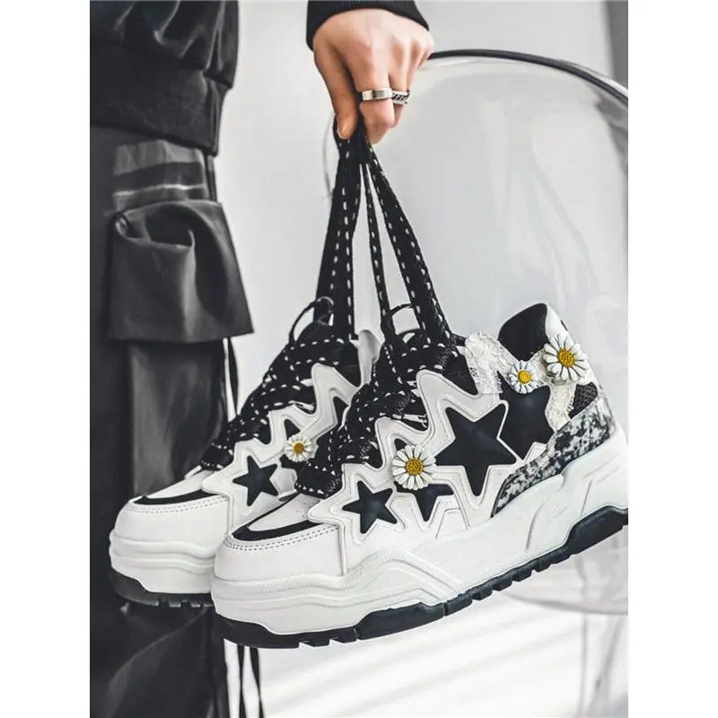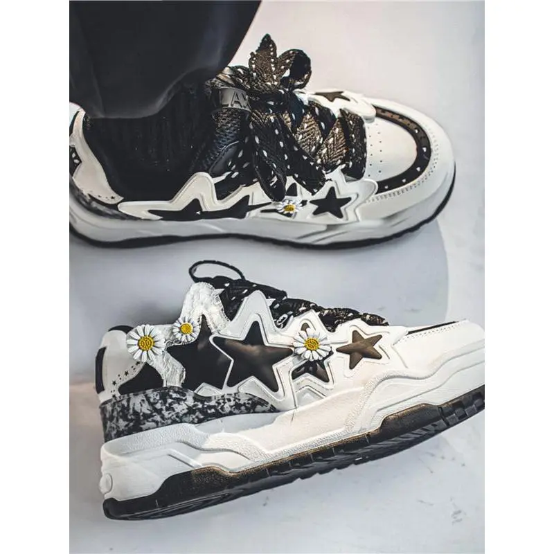 【Unique Star Daisy】: Featuring a distinctive star and daisy embellishment, making these sneakers eye-catching in any setting. 【Black and White】: The black and white color combination enhances versatility, pairing effortlessly with various outfits. 【Thick Sole】: Built with a thick rubber sole, providing better traction and durability for active urban adventures. 【PU Leather Upper】: Crafted from PU leather, ensuring a smooth finish and easy maintenance while offering a modern look. 【Ankle Height Cut】: Designed with a height that sits below the ankle, allowing for easy movement and a relaxed fit.