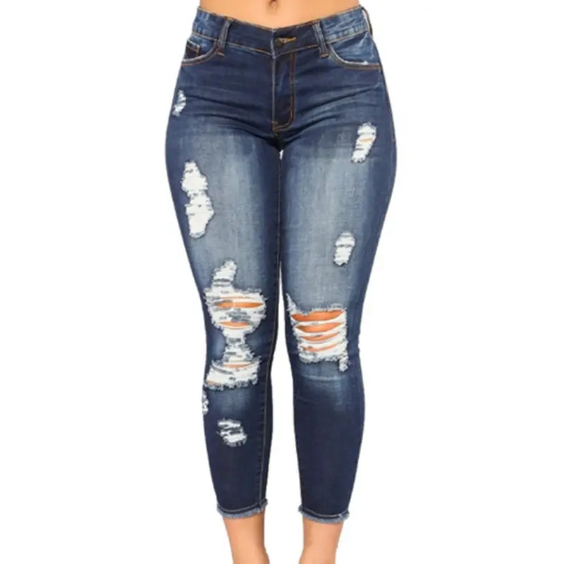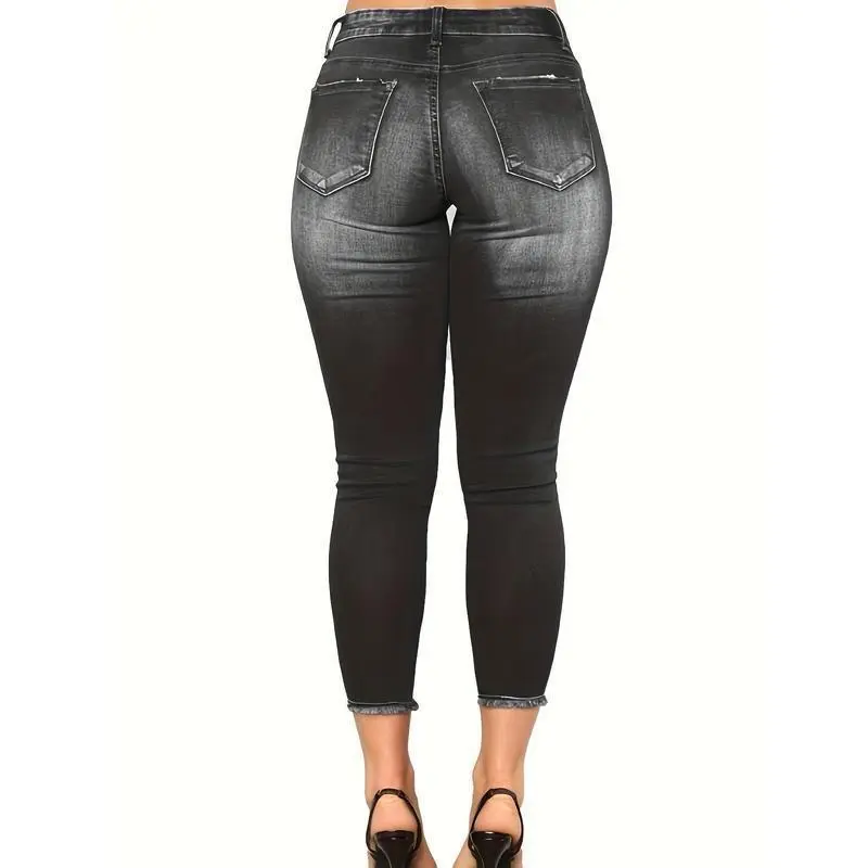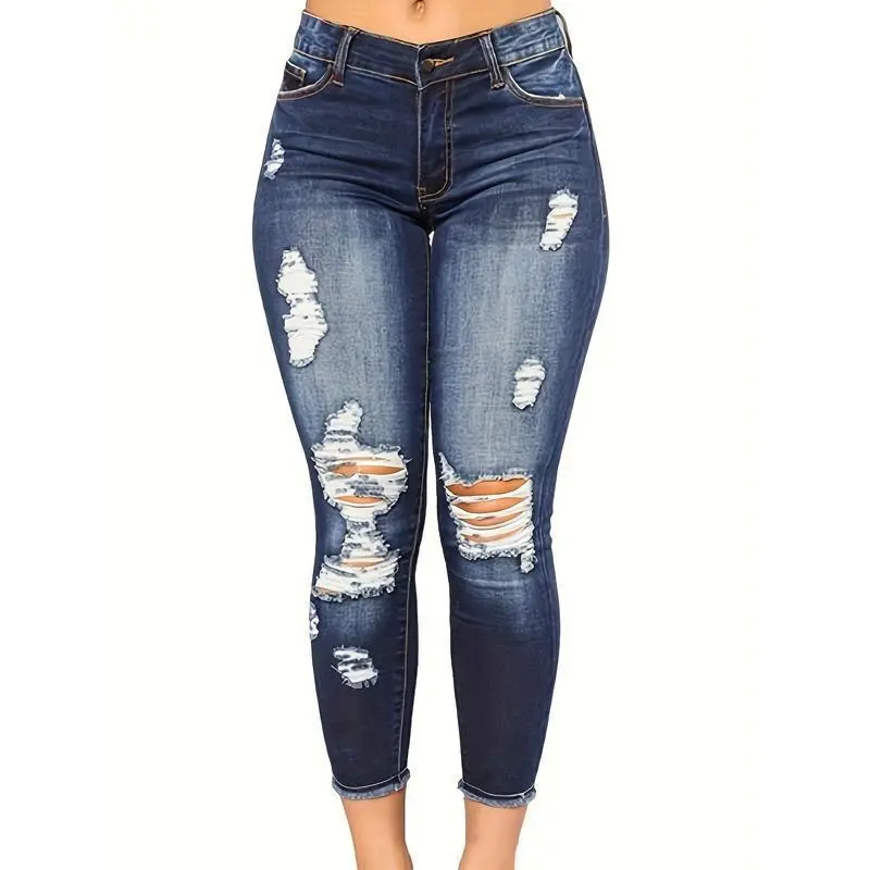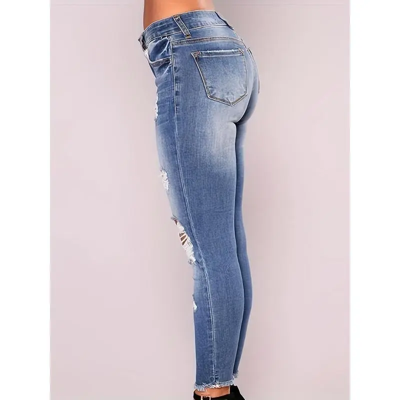 Women's Vintage Blue Stretch Skinny Jeans - Slim Fit, Distressed Details, Comfortable Blend, Suitable for Casual and Sports, Machine Washable, Spring/Summer Clothing|Ripped Detail Jeans|Smooth Texture Jeans