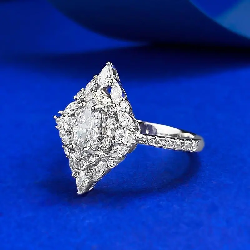 【966】Art Deco Geometric Marquise Ring | 4x8mm White Marquise Zirconia Center | Double Halo | Full Pave Band