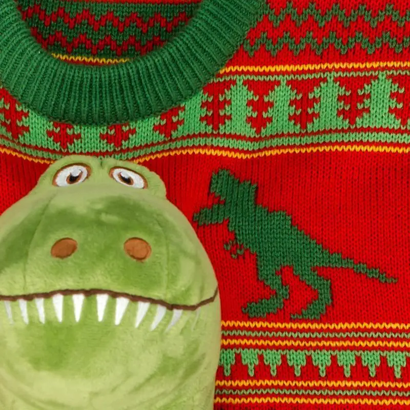 This Christmas season we wanted to do something different. Hence, we've created ugly 3-D Christmas sweaters. And what's uglier? A Stuffed T-Rex. Yes, we've made an ugly 3-D stuffed T-Rex Christmas sweater, and it'll make any person who wears it over the holidays feel as tipsy as one of Santa's elves who's worked too many hours in the toy workshop at the North Pole. Fans of dinosaurs or the Jurassic Park franchise will love this super fun 3D T-Rex Plushie Ugly Christmas sweater when it comes time to find your truly crazy, one-of-a-kind, ugly Christmas sweater. Featuring a dino bursting out of the chest and the back, this 3-D ugly Christmas sweater is a fun way to draw attention to yourself at your next Christmas party or friends and family get together.