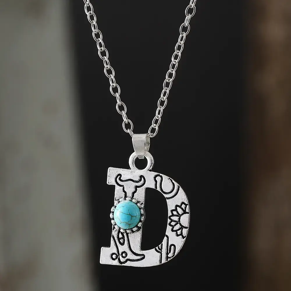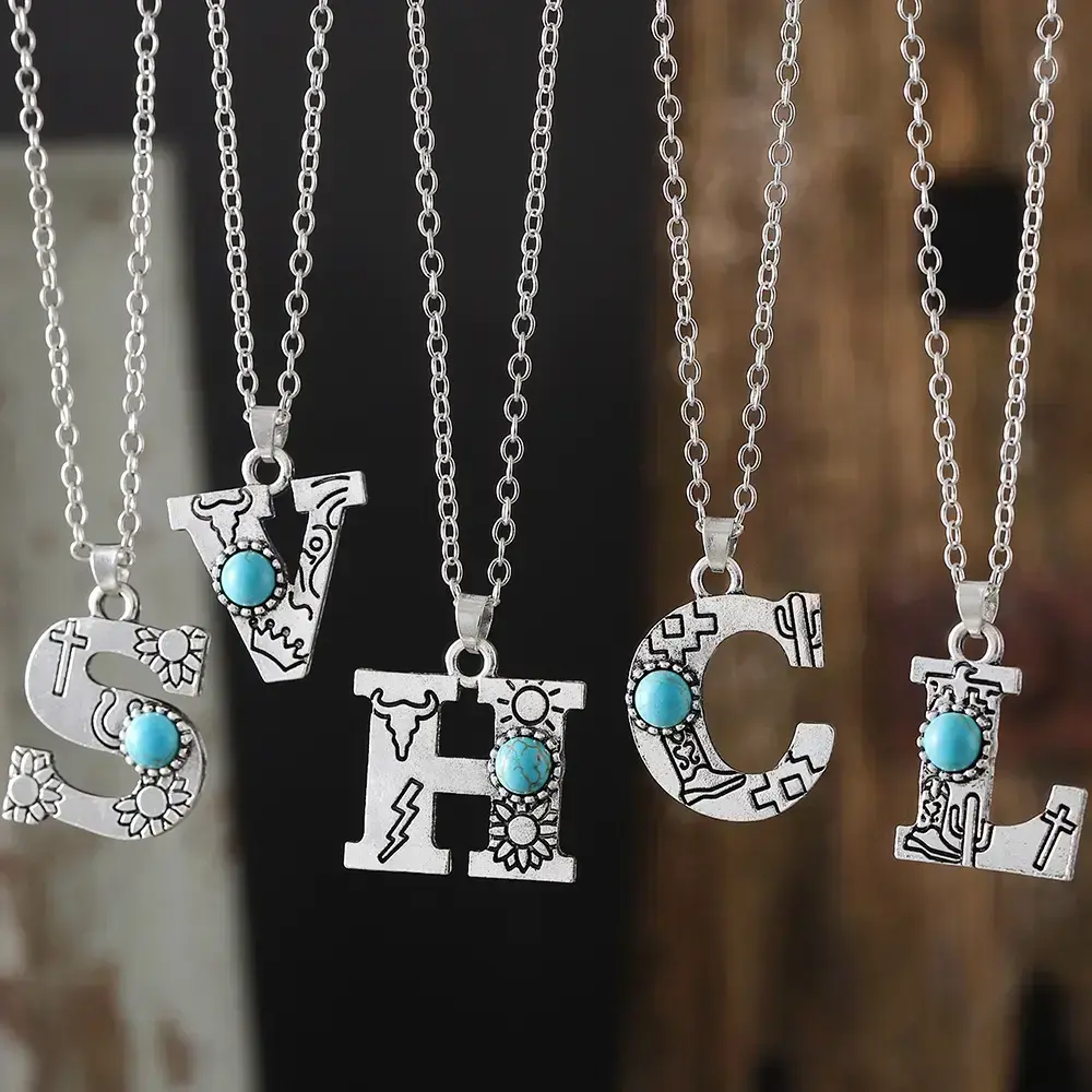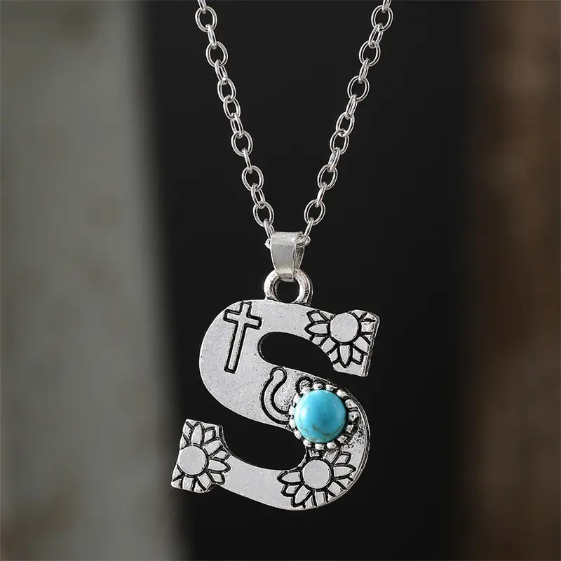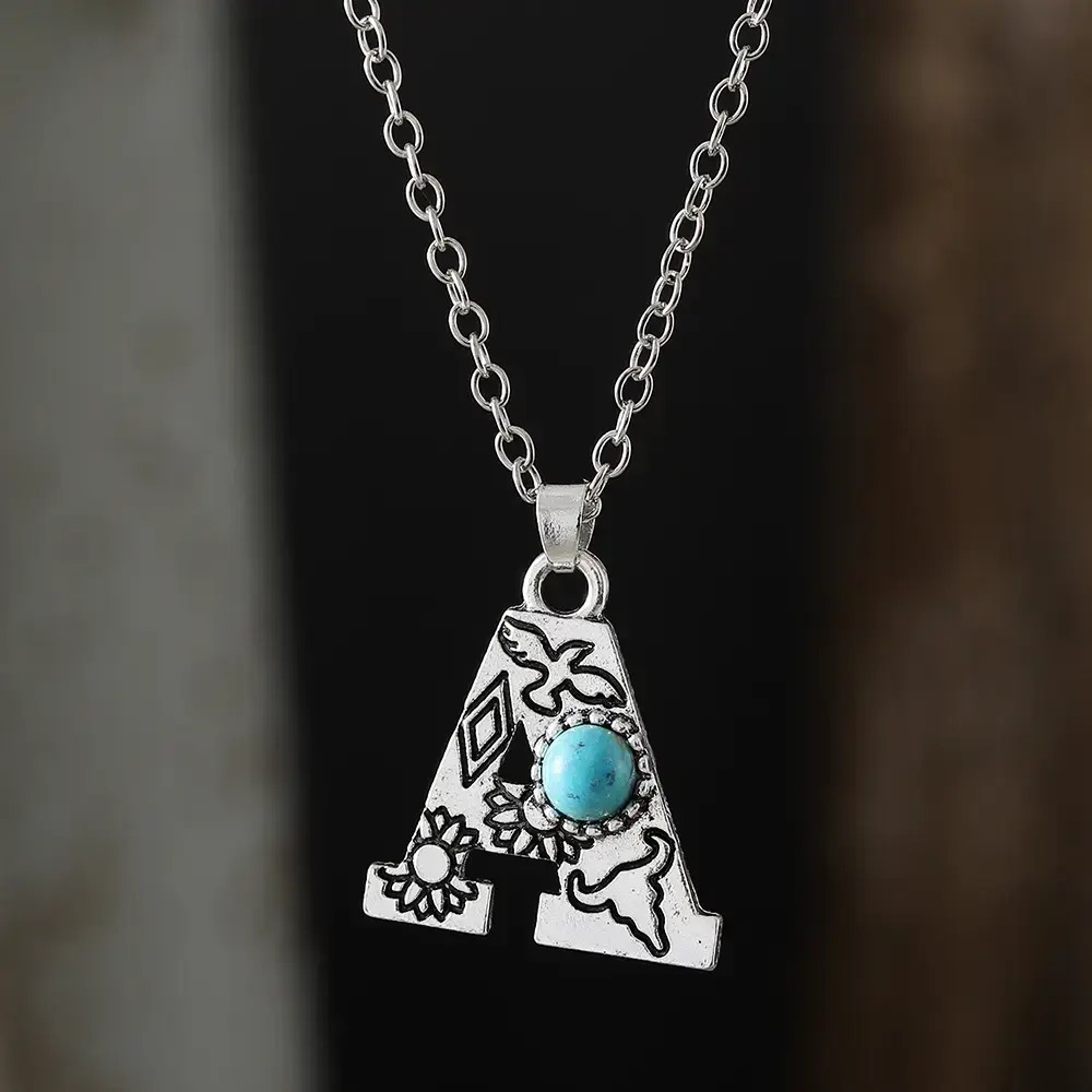 1pc Bohemian Western Style A-Z Letter Pendant Necklace with Turquoise Inlay, Sunflower Bullhead Patterned Charms, Vintage Jewelry Gift for Women Couple Fit Daily Wear