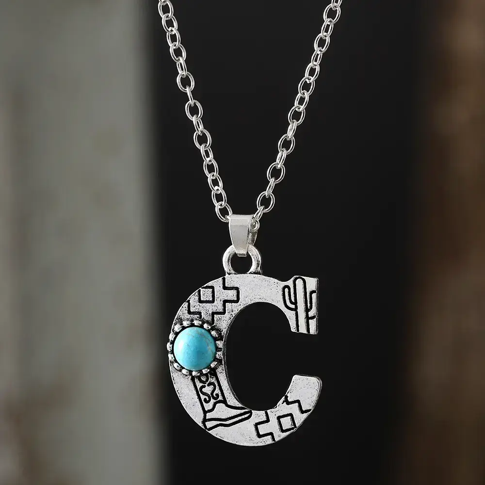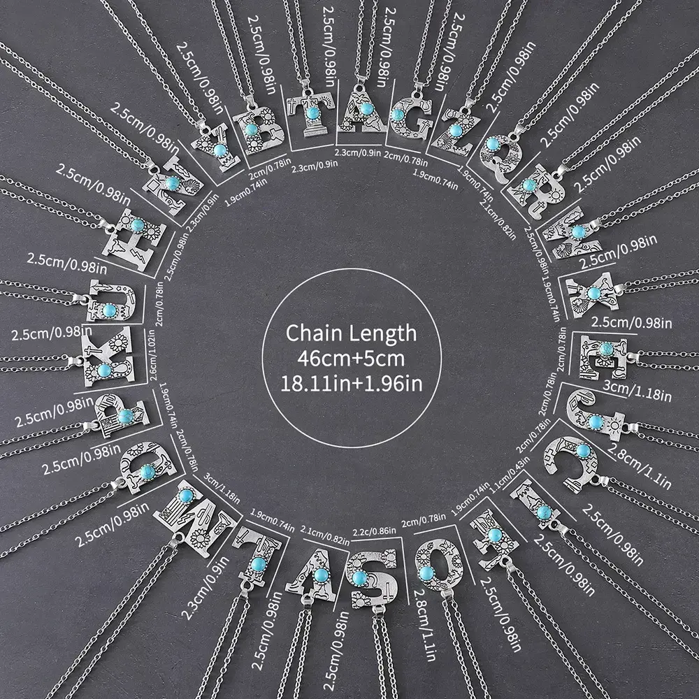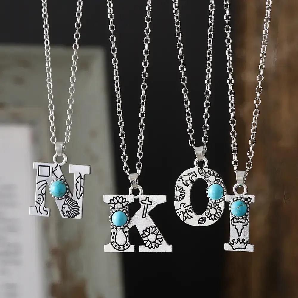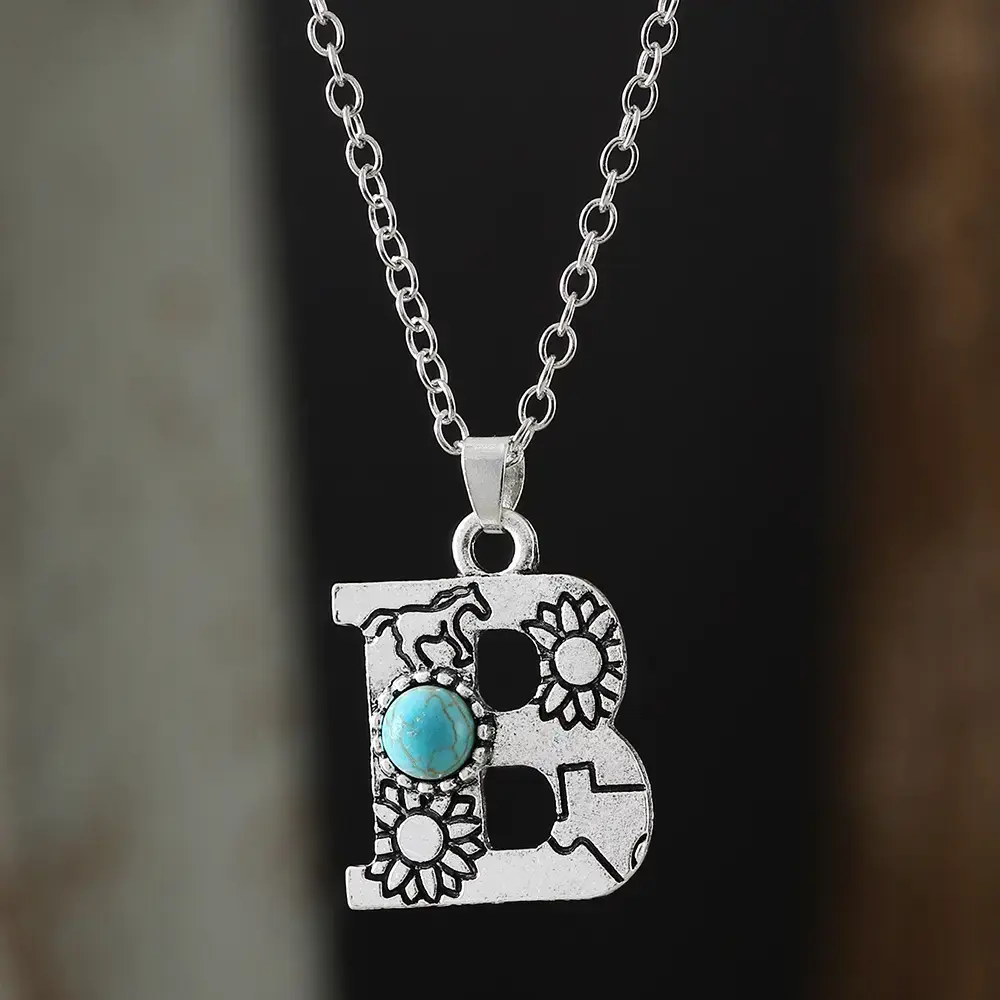1pc Bohemian Western Style A-Z Letter Pendant Necklace with Turquoise Inlay, Sunflower Bullhead Patterned Charms, Vintage Jewelry Gift for Women Couple Fit Daily Wear