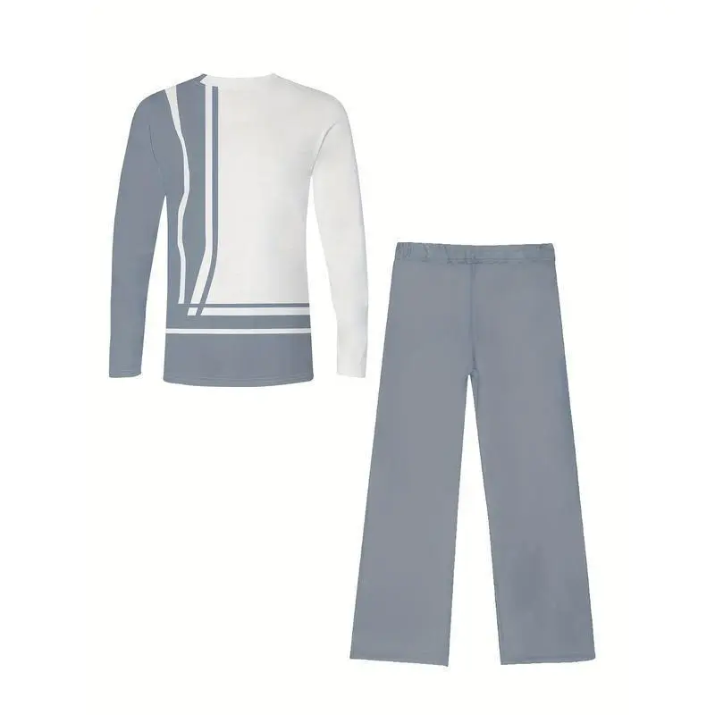 European and American Men's fashion long-sleeved trouser suit, classic simple white and gray two-color stitching print graphic print design, Men's breathable skin-friendly long-sleeved trouser suit