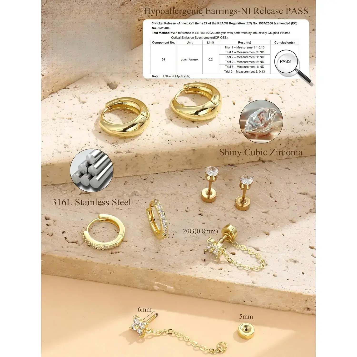 Flat Back Earrings for Women Hypoallergenic Surgical Steel Earrings for Sensitive Ears-20G Cartilage Earring Stacks Gold Hoops Flatback Stud Earring Sets for Multiple Piercing