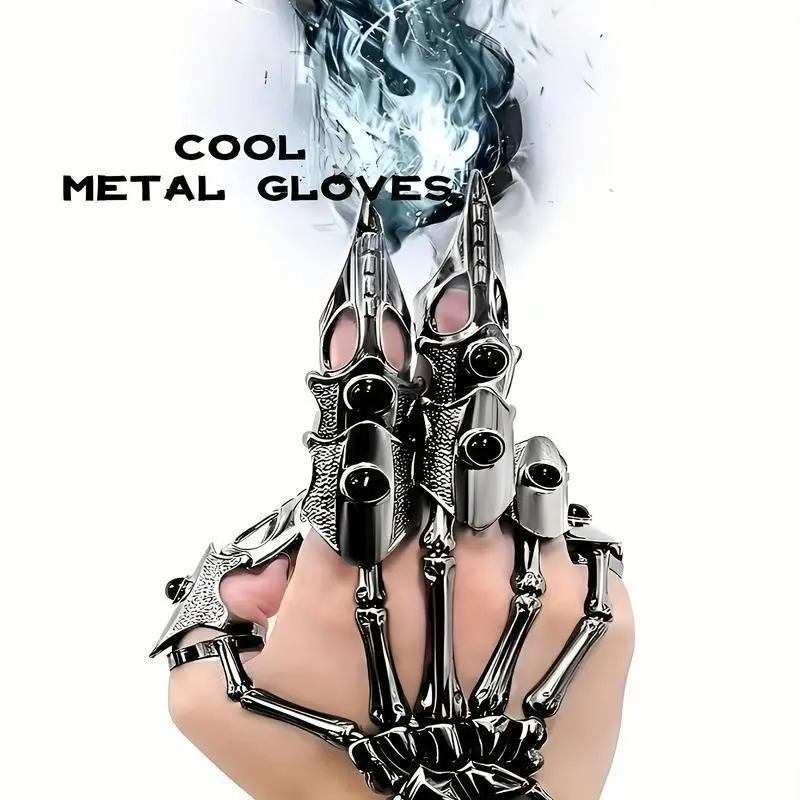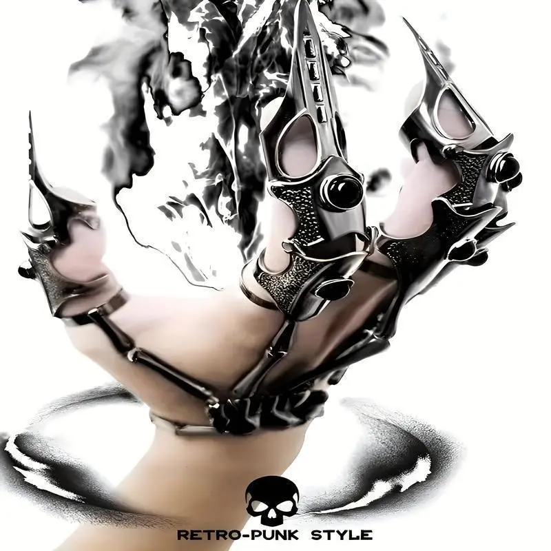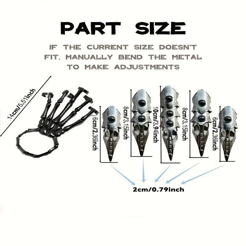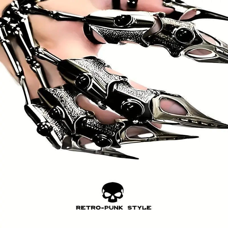 Adjustable Cyberpunk Black Alloy Bone Glove Set, Unique Bionic Mechanical Design with Claw Rings and Skeletal Structure, Silvery and Black Classic Fashion, Perfect for Day of the Dead Party Decorations, Suitable as a for Girlfriend, Without Feathers, Met