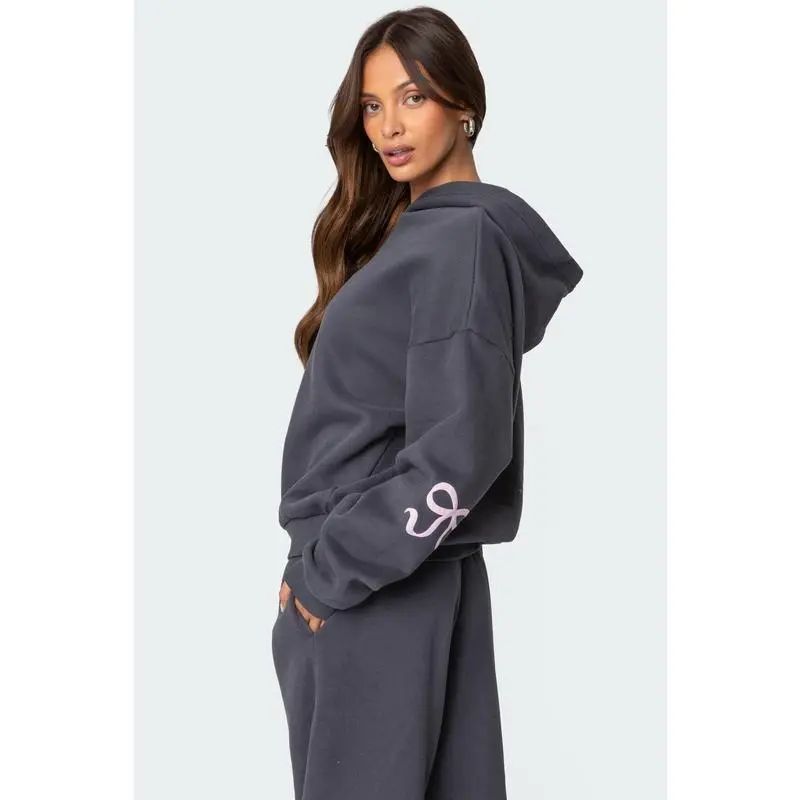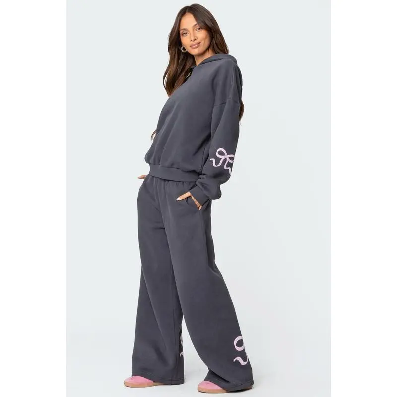 Bonney Bow Detail Hoodie Set, Womens 2 Piece Lounge Sets Bow Trim Print Hoodie Set Fall Fashion Oversized Sweatshirts Wide Leg Sweatpants Clothes Womenswear