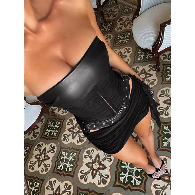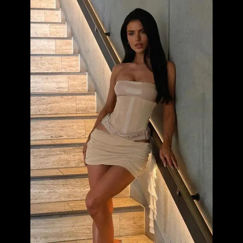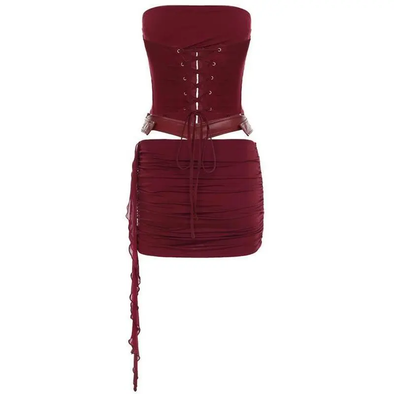 Two-piece Set Women's Solid Color Lace Up Corset Tube Top & Grommet Eyelet Decor Skirt, Fashion Casual Strapless Top & Ruched Skirt for Party Club Dating, Ladies Summer Clothes, Matching Clothing Set, Womenswear Suits Basic Gamis Burgundy Minimalist Shor