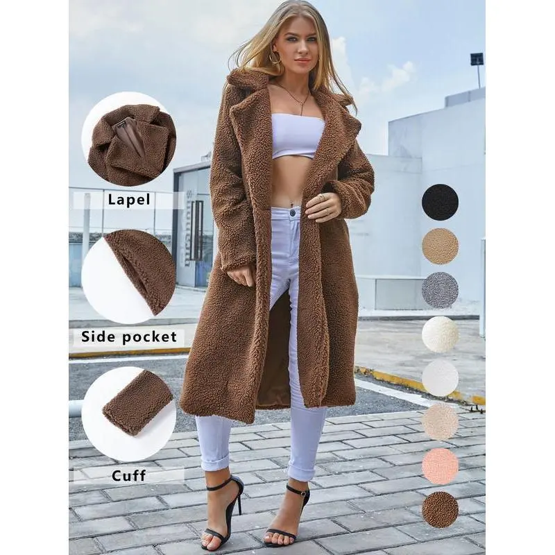Elevate Your Winter Wardrobe ?Embrace the season with this long sherpa jacket. It features a stylish lapel collar and practical side pockets, perfect for casual outings or parties. The oversized design ensures you stay warm and comfortable. Available in multiple colors, this versatile coat complements any outfit. Pair it with jeans for a casual look or dress it up for a night out. Stay warm and chic effortlessly. ??Lapel: Adds a sophisticated touch to your ensemble. ??Side Pocket: Handy for keeping small essentials. ??Cuff: Enhances the overall appearance of the coat. Versatility Meets Style This coat blends functionality with fashion, making it a must-have for the season. Choose your preferred color and enjoy both warmth and elegance. The jacket's design allows for endless styling options, ensuring you look chic while staying cozy. Perfect for women seeking a blend of comfort and style in their winter wear.