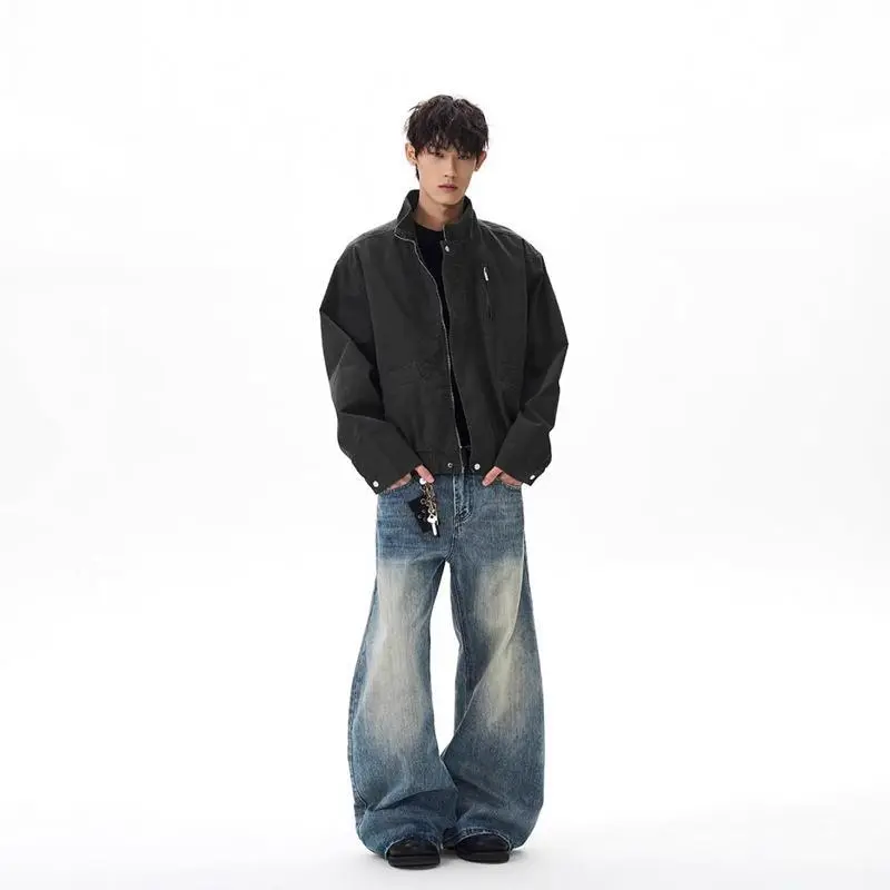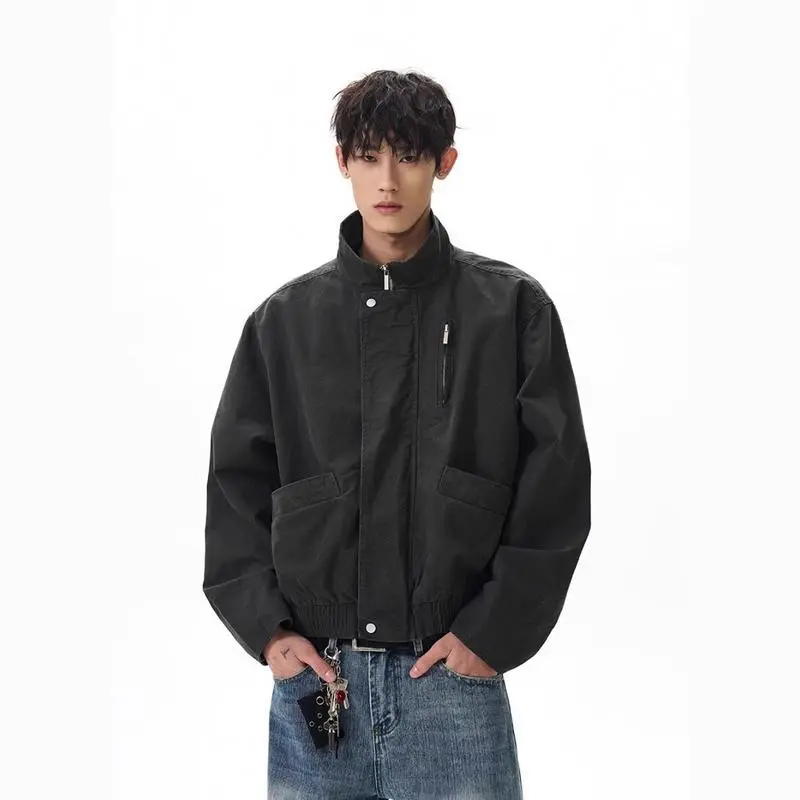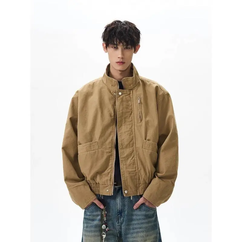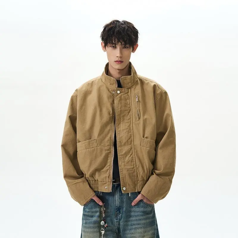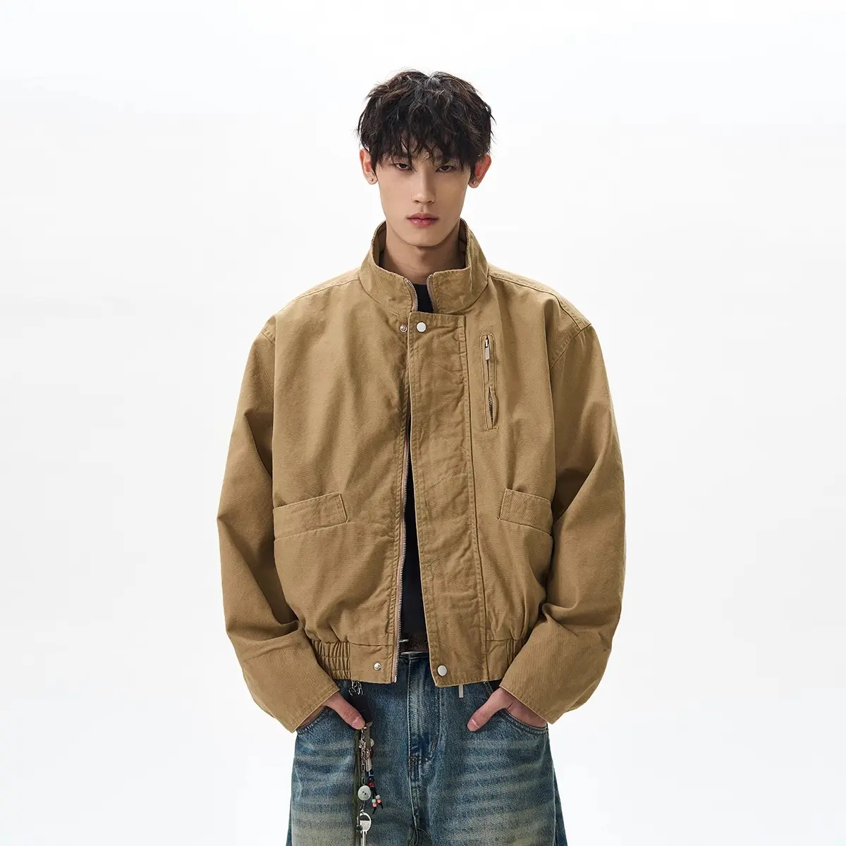 Spring Autumn Men's Casual Trendy Washed Vintage Stand Collar Zipper Canvas Jacket New Fashion Vintage Bomber Coat Male