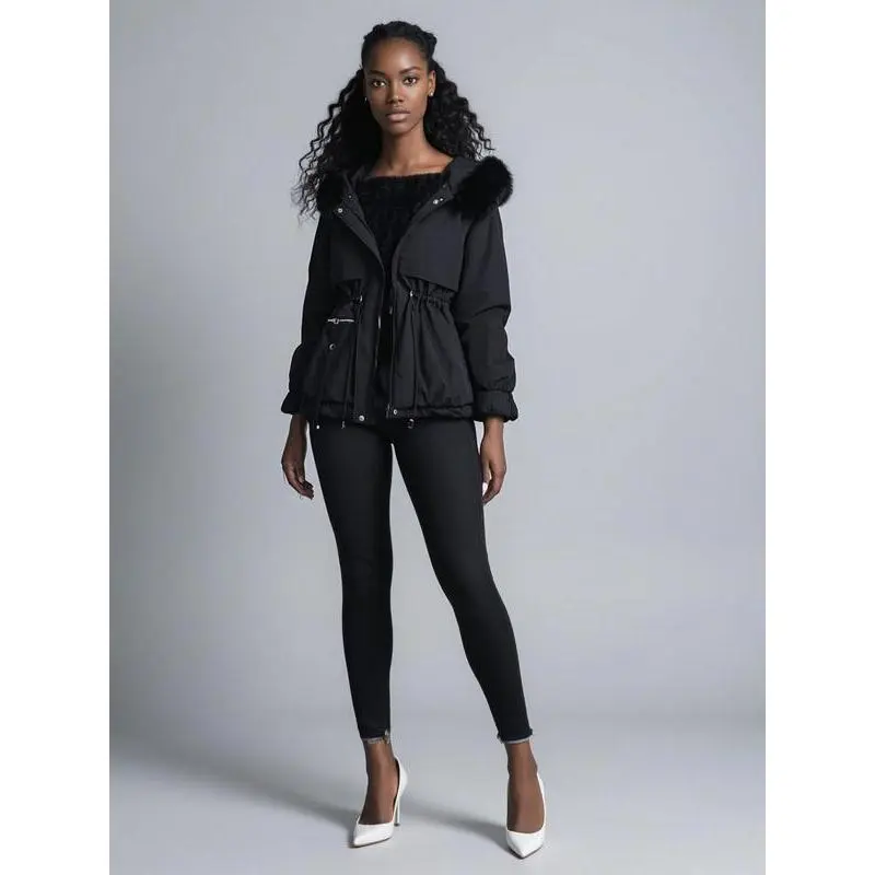 FleeceLinedFurHoodDownJacketWomenWinterWarmDrawstringZipperPaddedParkasCasualCottonCoatsPufferOutearsWomenswearTopsBasicBlack