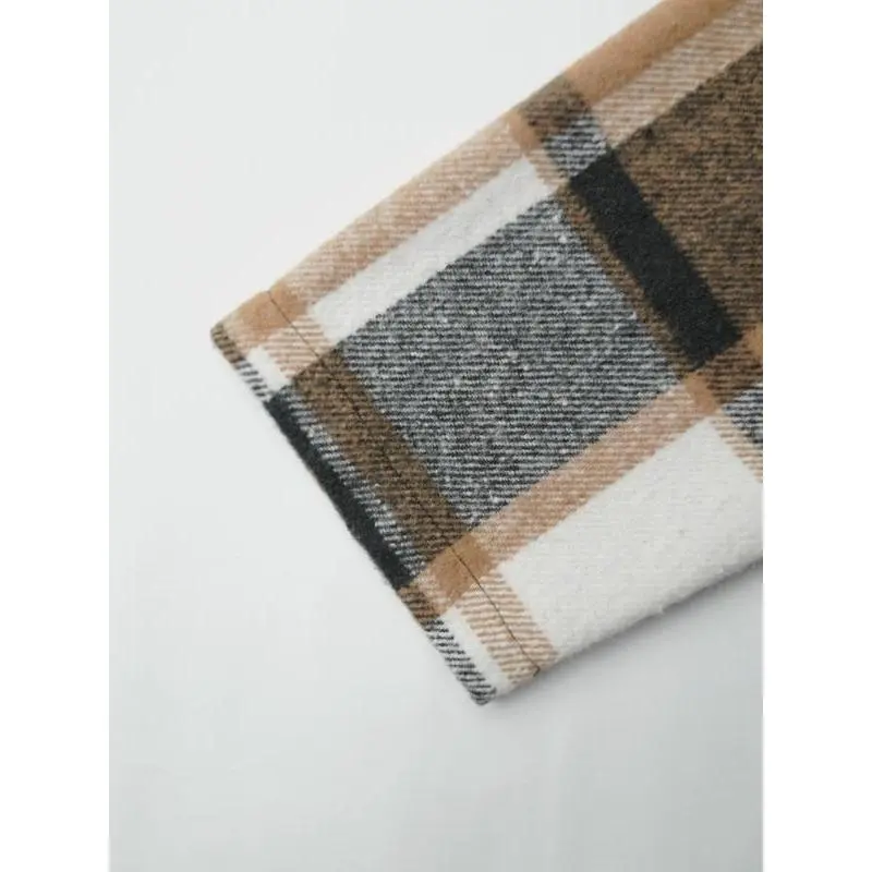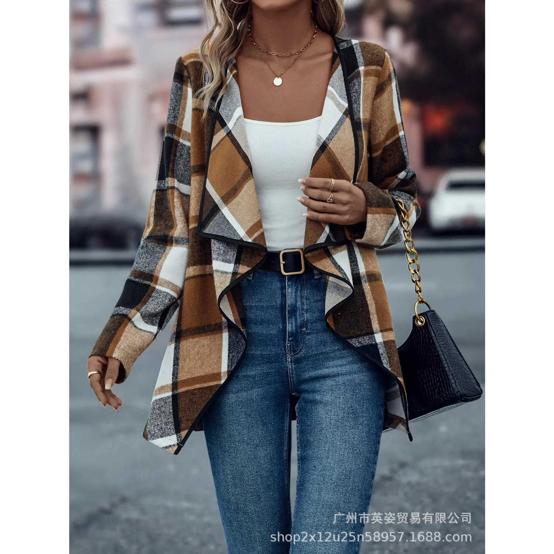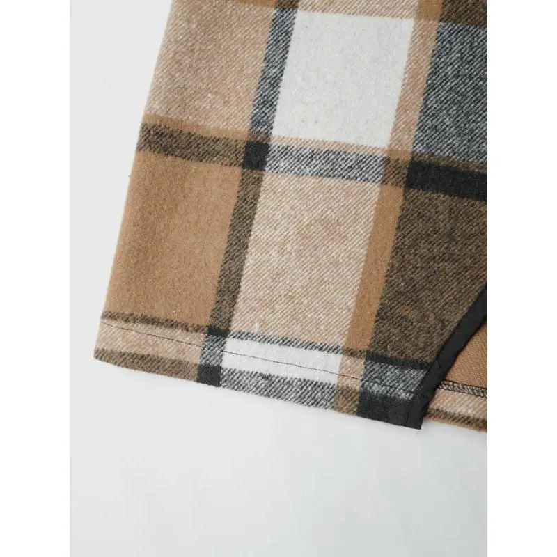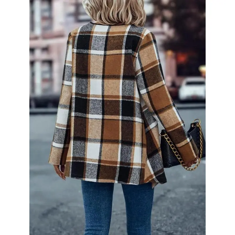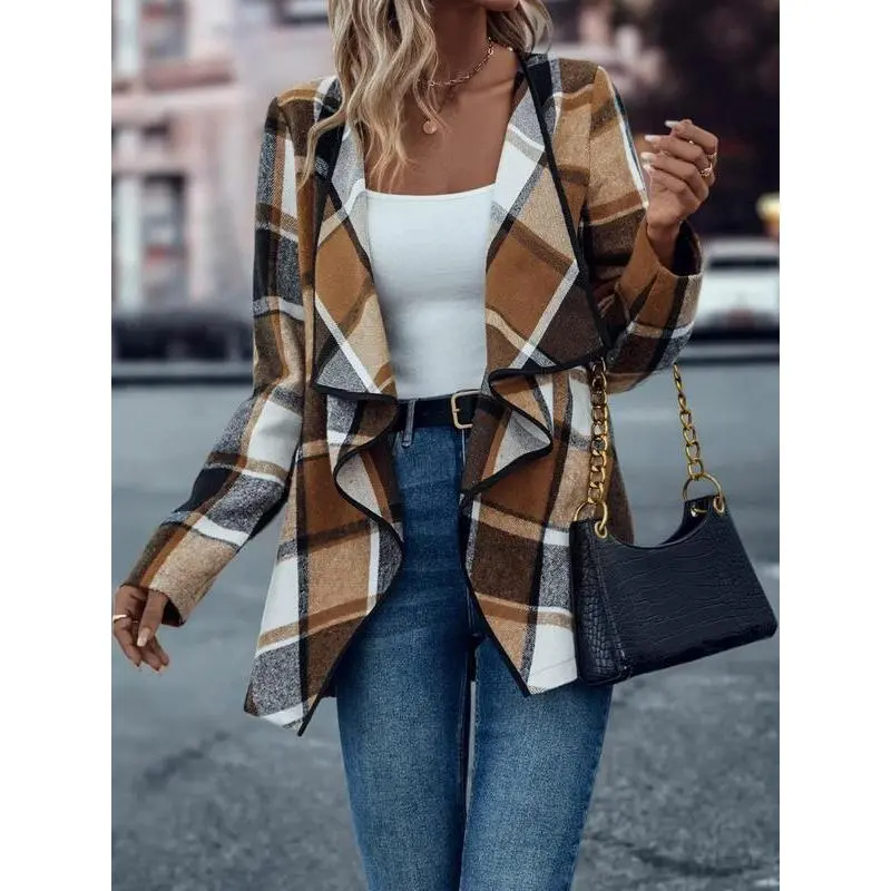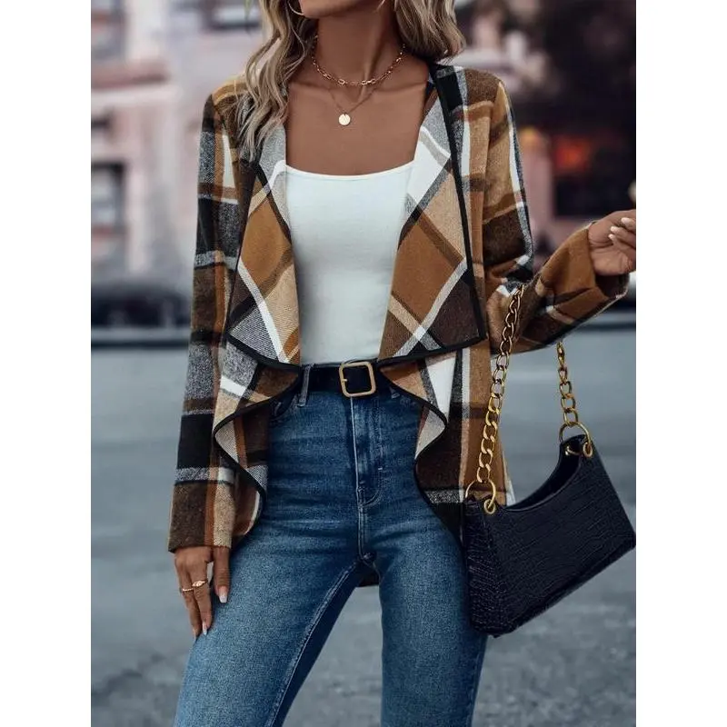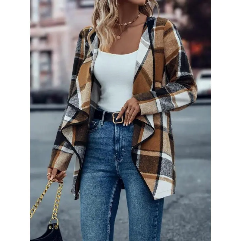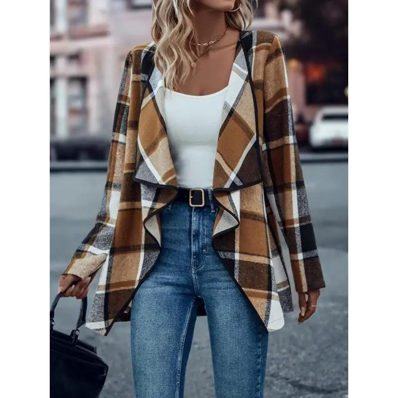 Women's Plaid Cascade Collar Asymmetrical Hem Tweed Coat, Casual Long Sleeve Jacket for Spring & Fall, Perfect for Daily Wear and Office Events