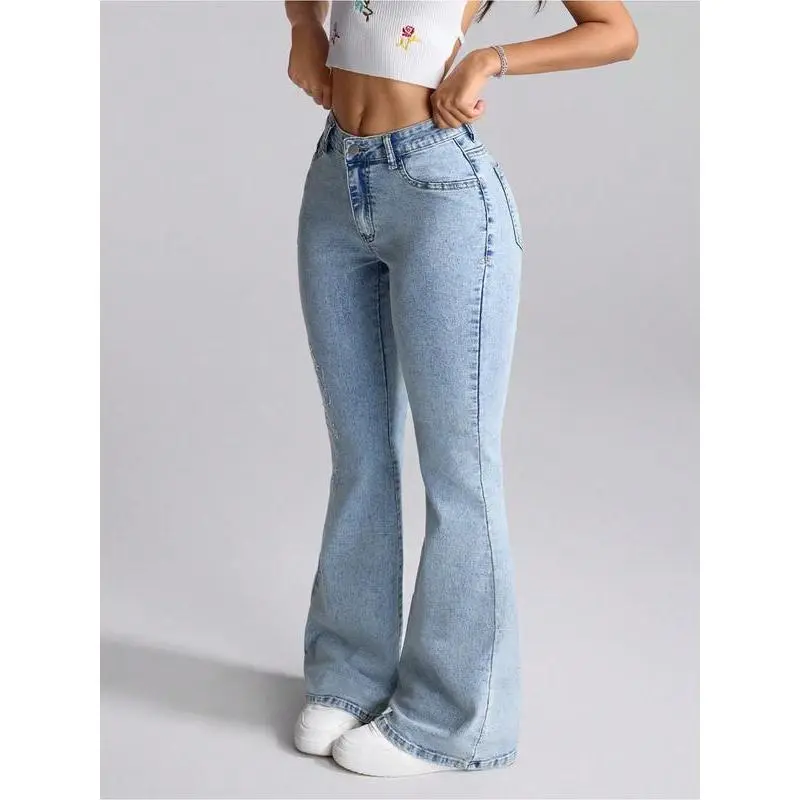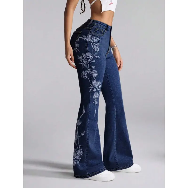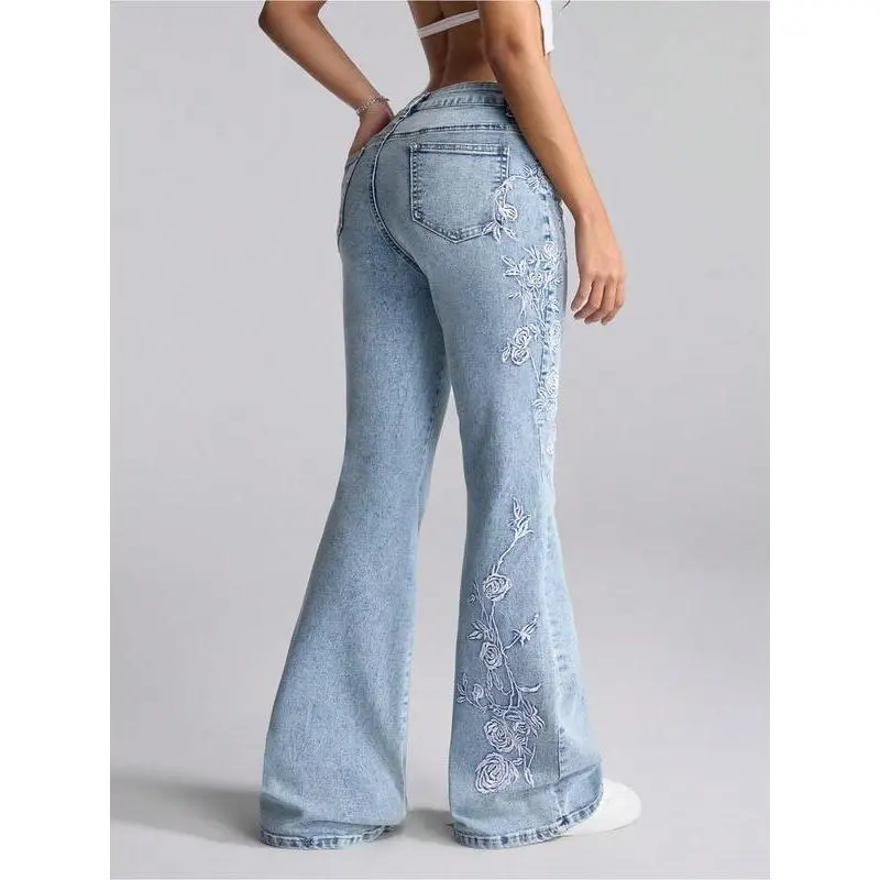 ��Handcrafted embroidery��: Features intricate hand-stitched embroidery, setting it apart from ordinary denim bottoms and adding exclusivity. ��Fitted silhouette��: Designed with a fitted cut that accentuates the body's natural curves while providing a tailored look. ��Moderate fabric thickness��: Constructed from moderate thickness fabric, suitable for all seasons, ensuring year-round wearability. ��Unique flared hem��: Incorporates a micro-flare at the hem, providing a trendy twist that enhances movement and style. ��Durable water-washed denim��: Crafted from heavy-duty water-washed denim, ensuring both durability and a soft, lived-in feel from the first wear.