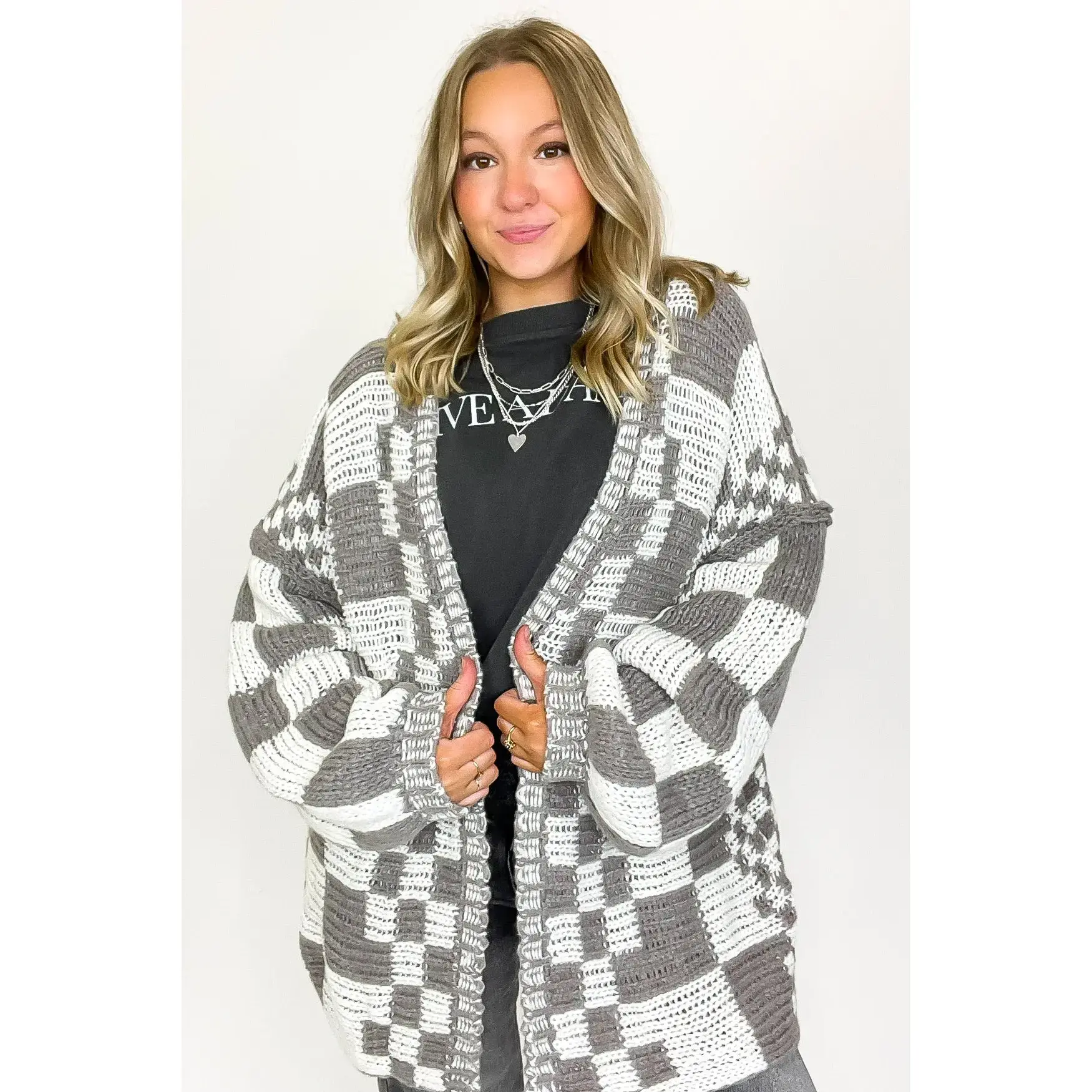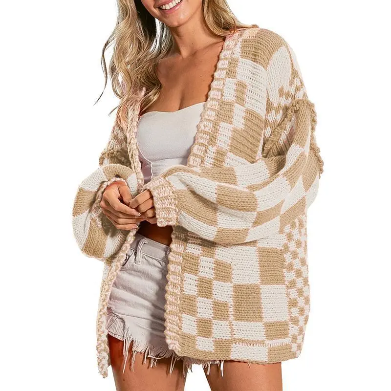 Details: Say hello to your new obsession — The Vibe Check Chunky Cardigan is where bold meets cozy. Featuring a mix of playful checkered patterns and colorblocking, this statement knit is made to turn heads and elevate your laid-back looks. The oversized, loose-fit silhouette gives major chill-girl energy while keeping you wrapped in warmth. From coffee runs to couch hangs, this cardigan is an instant mood — fun, effortless, and totally on trend. Wear it open over a basic tank or buttoned up as a stand-alone moment. Either way, it’s giving “main character.” - Long sleeves