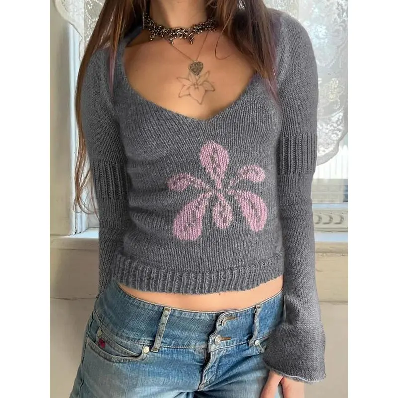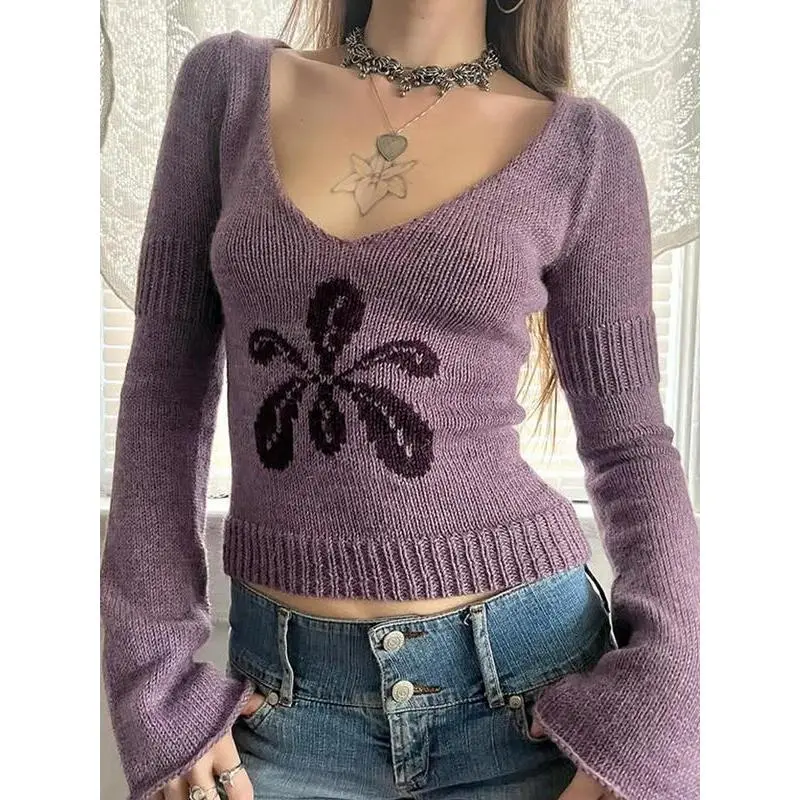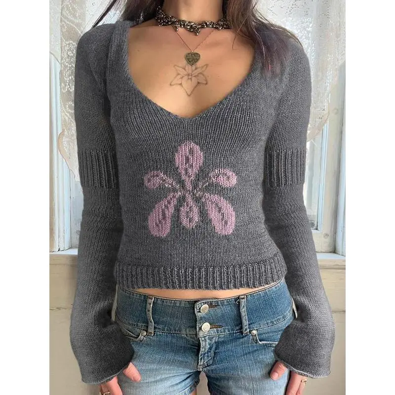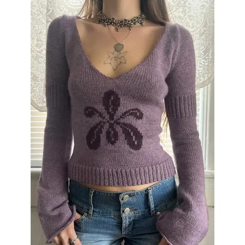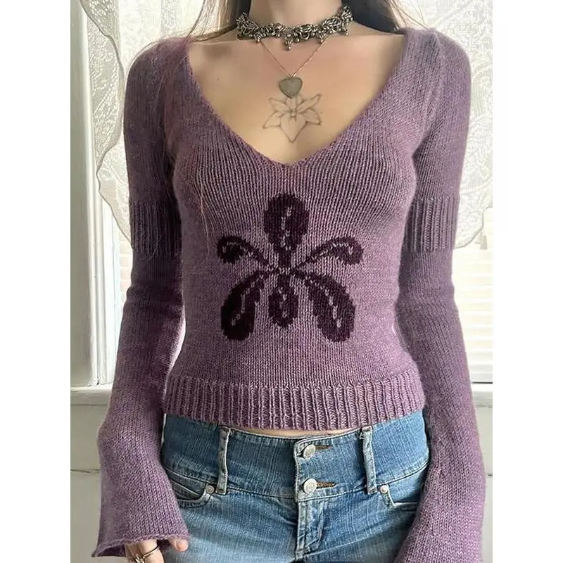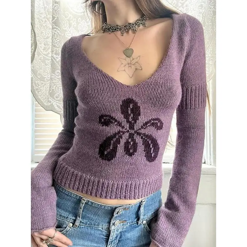 Autumn Winter New Fashion Vintage Floral Jacquard Slim Fit Long Sleeve Sweater V Neck Y2K Aesthetic Pullover Knitwear(gift)