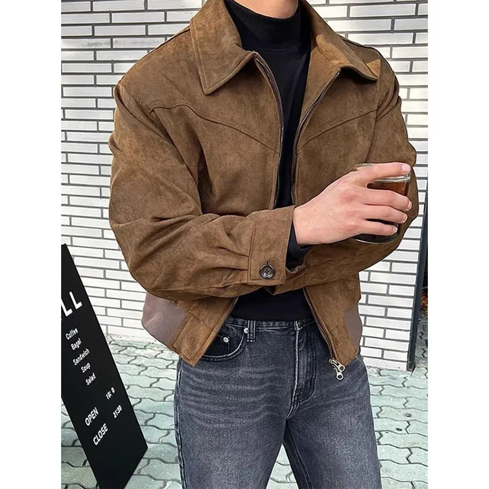 Material Quality :/Crafted from premium suede, this coat offers a soft touch and durable wear, perfect for the autumn and winter seasons./Design and Style :/Featuring a retro American style with a short lapel, this jacket adds a touch of vintage charm to any outfit./Origin :/Made in China, this coat combines traditional craftsmanship with modern design, offering a unique blend of culture and style./Fit and Comfort :/Designed with a regular length, this jacket ensures comfort while maintaining a sleek silhouette./Versatility :/With its brown coffee Maillard color scheme, this coat pairs seamlessly with various ensembles, making it an all-match piece.