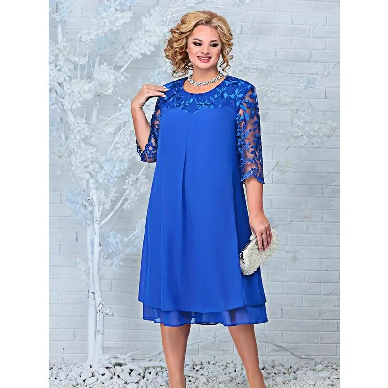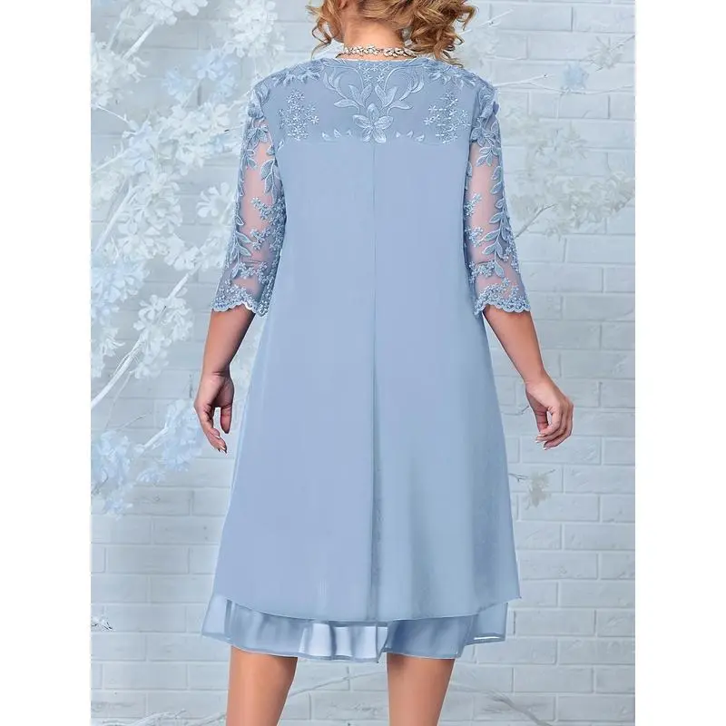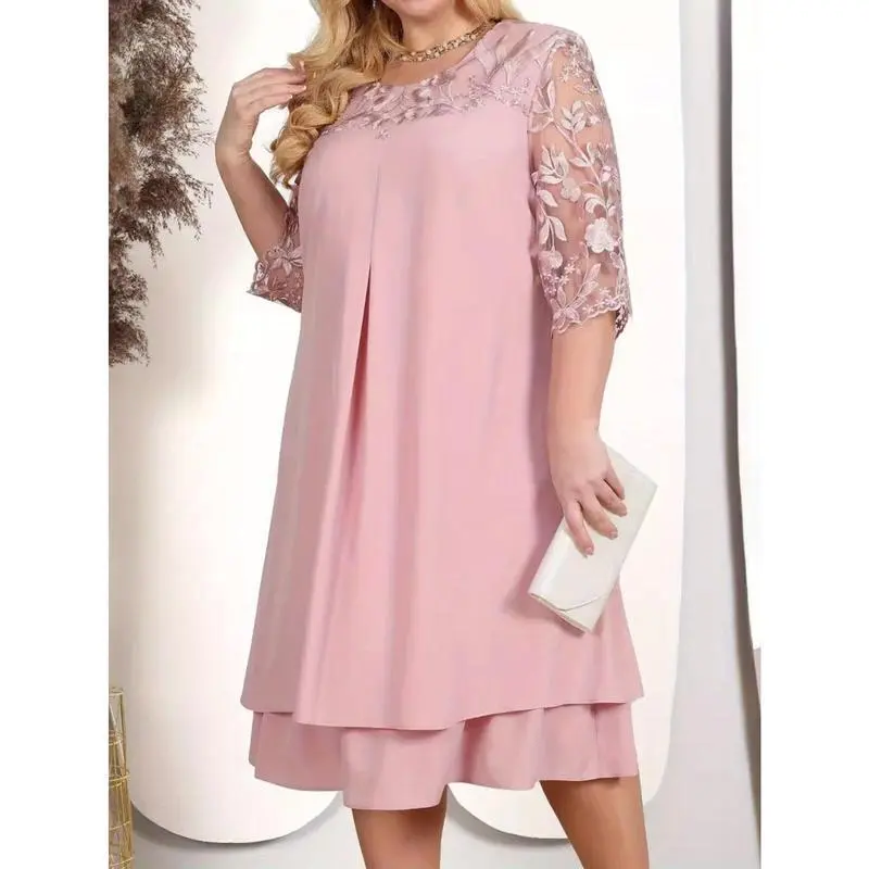 Embroidered Chiffon Dress Elegant Plus Size Mother of the Bride Dress with Round Neck, Short Sleeves, European and American Womenswear Aesthetic Casual Style
