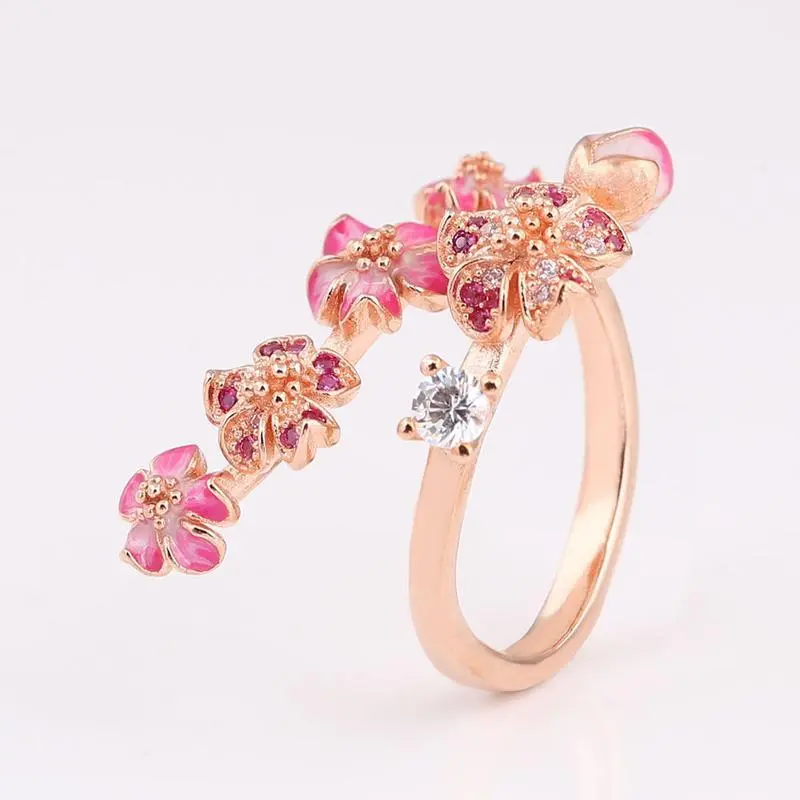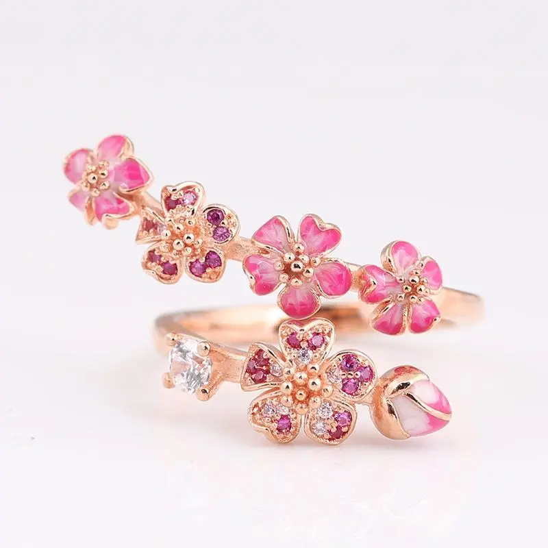 S925SilverRoseEnamelPeachBlossomWithCrystalRingForWomenWeddingPartyGiftfitLadyFineJewelry