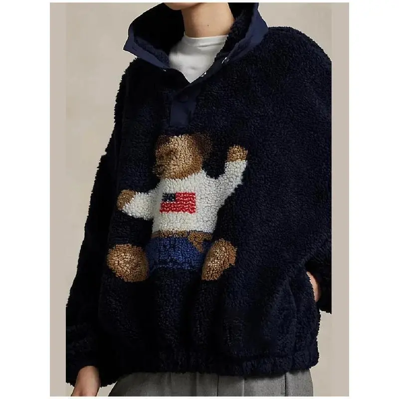 Autumn Winter Soft Cartoon Bear Lamb Jacket For Women Stand Neck Long Sleeve Loose Coat 2025 New Lady Warm Thick Outwears