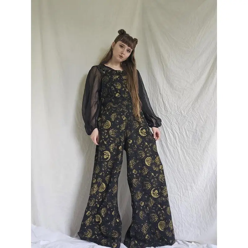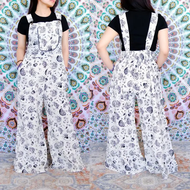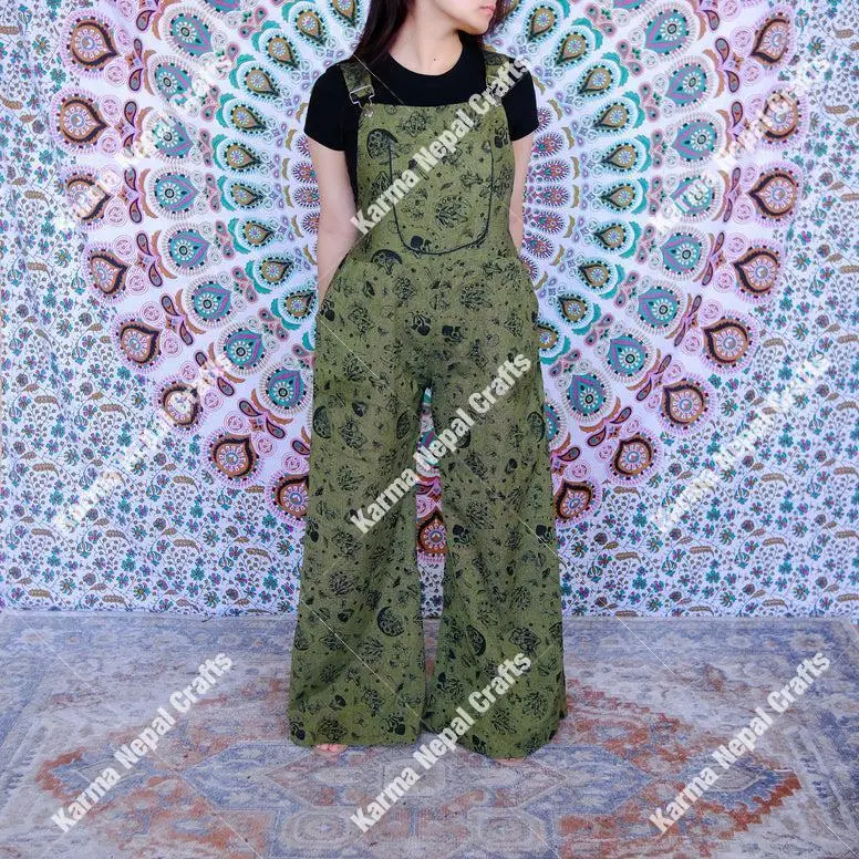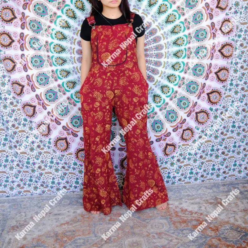 Enjoy effortless boho chic style with our handmade Magical Celestial/Mushroom Bell Bottom Jumpsuit. Featuring wide leg pants and flowy dungarees, this unisex jumpsuit is ideal for summer festivals and free-spirited fashion. The celestial and mushroom prints, along with adjustable straps and a bib pocket, add retro and bohemian vibe. Handmade in Nepal Material: Organic Cotton Size: One Size; Fits up to US Size Large ** This Bell Bottom Jumpsuit has a bib pocket on the front along with two side pockets. ** The Straps are adjustable as it has a suspender design ** The back of this jumpsuit has elastic which allows you to have more stretch and fits the way your body is. ONE SIZE MEASUREMENTS Length from top of bib: 51" Total Length from top of Strap: Approx. 60" (The Straps are adjustable) Waist: Approx. 24" to 41" Hip: Fits up to Approx. 46" Inseam: Approx. 29 inches PLUS SIZE MEASUREMENTS Length from top of bib: 51" Total Length from top of Strap: Approx. 63" (The Straps are adjustable) Waist: Approx. 38" to 56" Hip: Fits up to Approx. 52" Inseam: Approx. 31" ** ETHICALLY SOURCED ** FAIRTRADE ** SUSTAINABLE FASHION