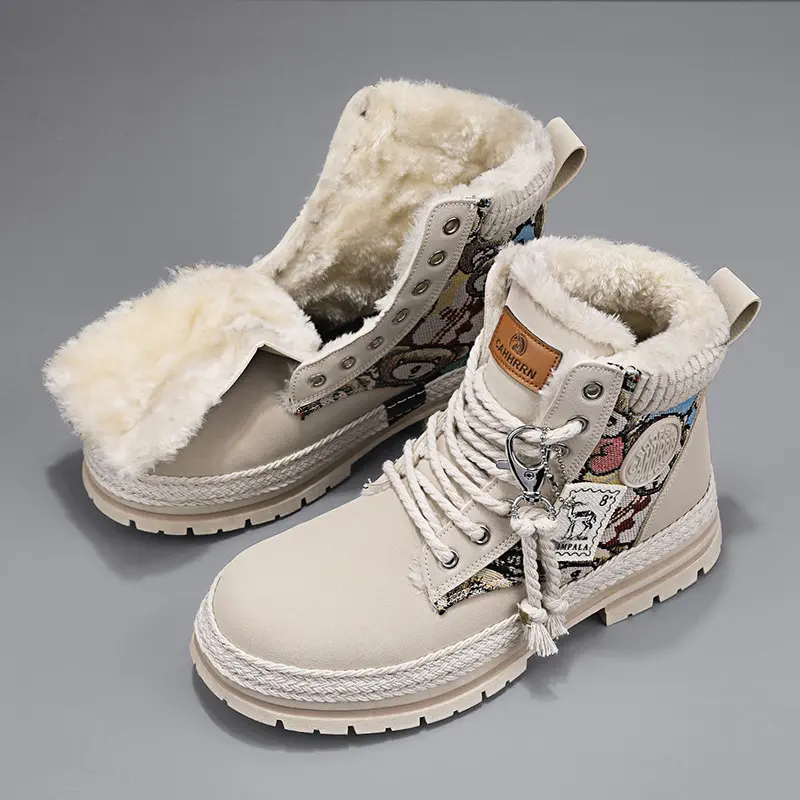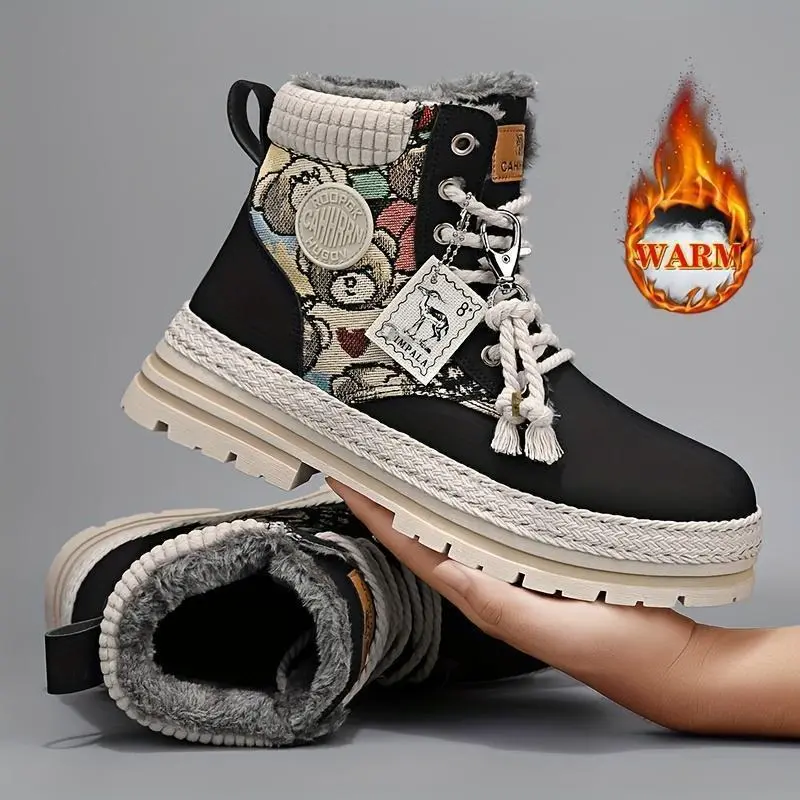 Autumn and Winter New Men's High-top Grass Weave Bear Pattern Boots Warm Work Boots Outdoor Motorcycle Boots