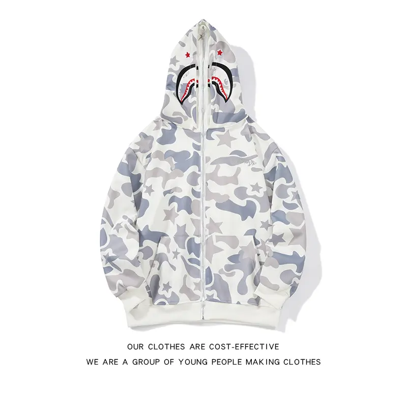 American High Street Double Hood Camouflage Shark Zip Embroidered Sweatshirt for Men and Women Same Couple Jacket Spring Autumn Thin Hip Hop Original National Chic Brand Loose Hooded Cardigan