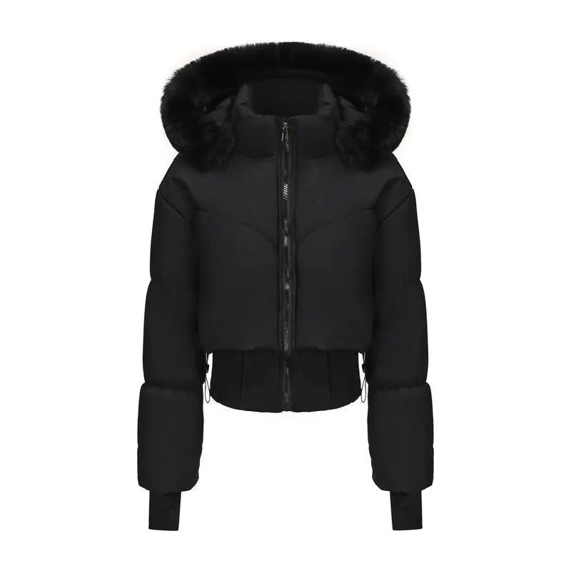 Large Fur Collar Hooded Short Cotton Jacket for Women, Thickened and Warm Cotton Coat for Autumn and Winter, Waist-Cinching Outerwear Womenswear Tops Casual Long Sleeve Basic Black Fitted Minimalist