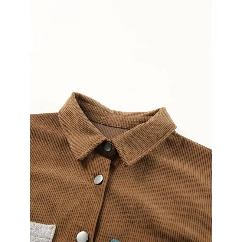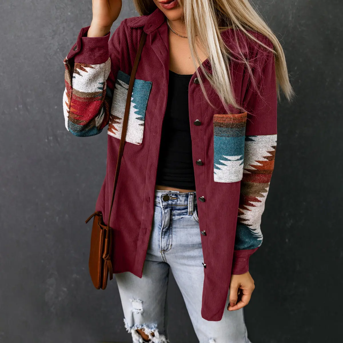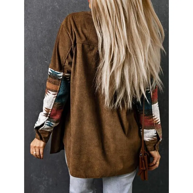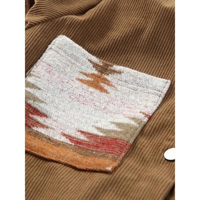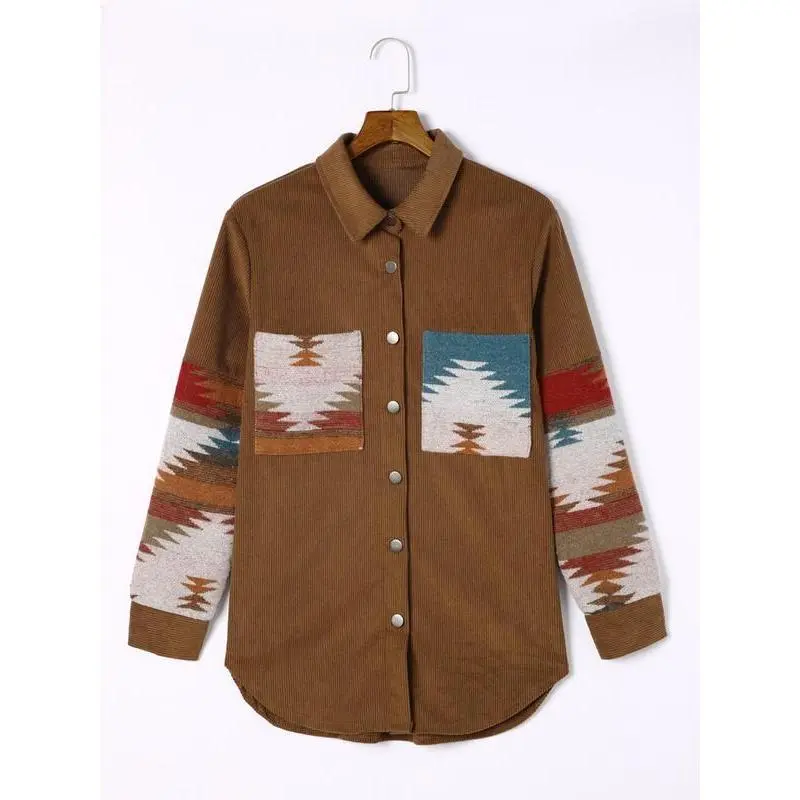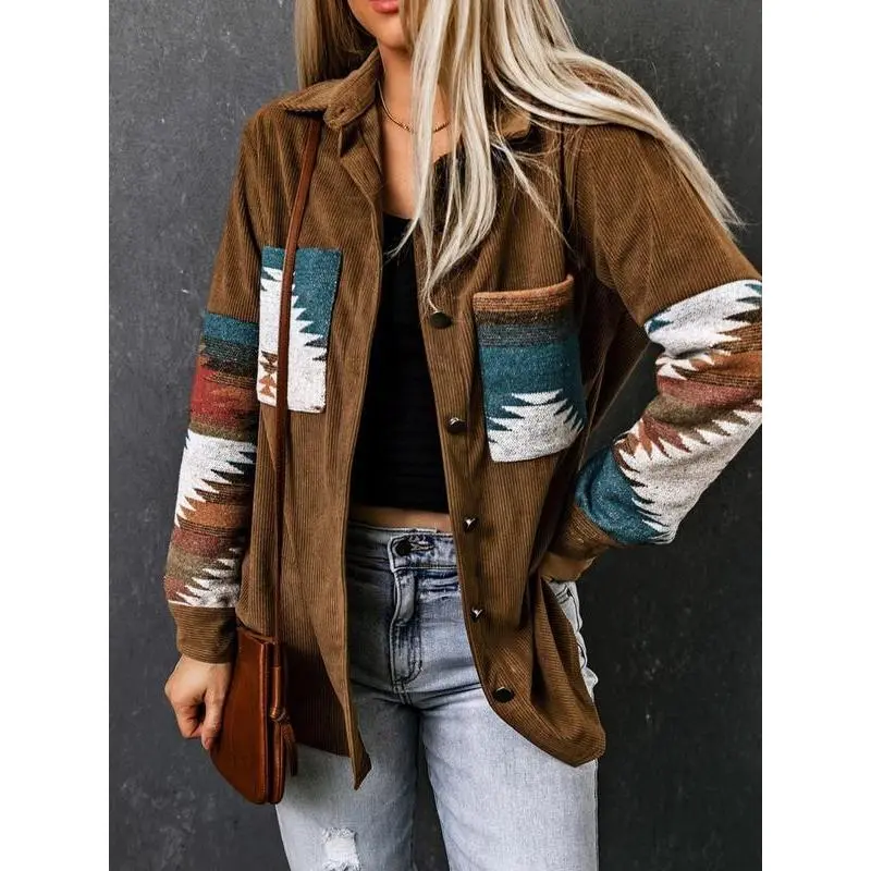 Women's Western Geometric Print Collared Button Front Corduroy Coat, Casual Pocket Long Sleeve Outerwear for Spring & Fall, Ladies Clothes for Daily Wear
