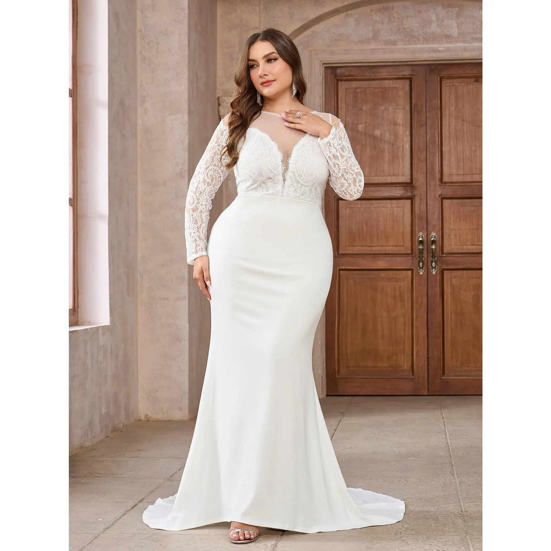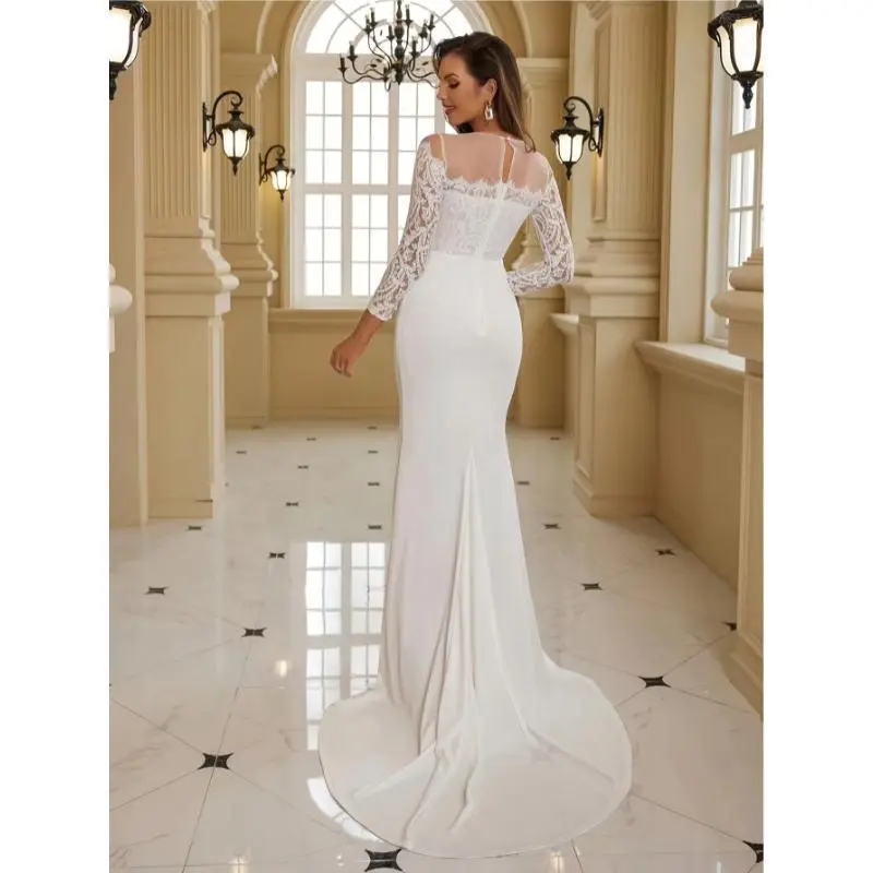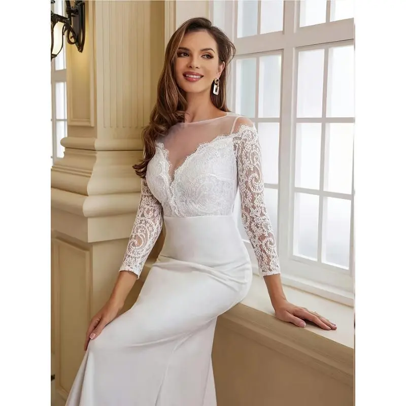 Elegant K66 Style Gown for Women - V-Neck, Long Sleeve, Solid Color Jersey Material, Perfect for Weddings and Formal Events, Wedding Dresses Collar Fabric Womenswear Comfort Polyester Chic White Basic Minimalist Bridal Outfit