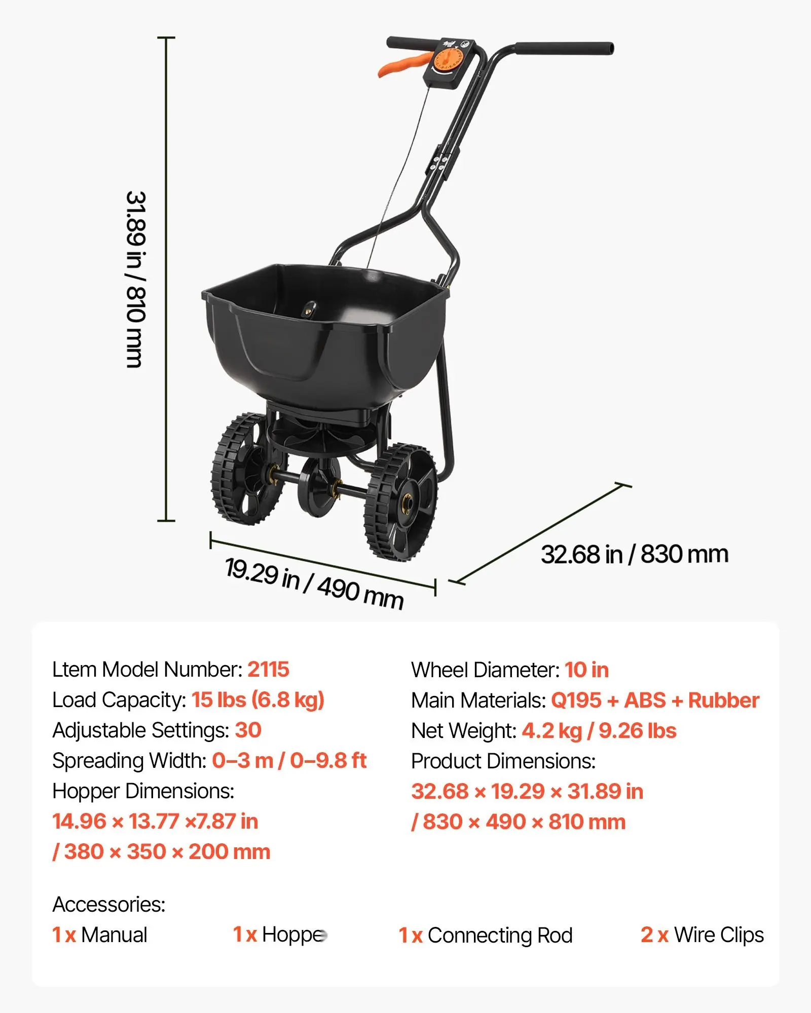·Durable, Outdoor-Ready Build: This durable broadcast spreader is constructed with a powder-coated steel frame and UV-resistant, impact-resistant hopper. The 10" pneumatic tires handle grass, gravel, and snow with ease, making it suitable for all outdoor conditions