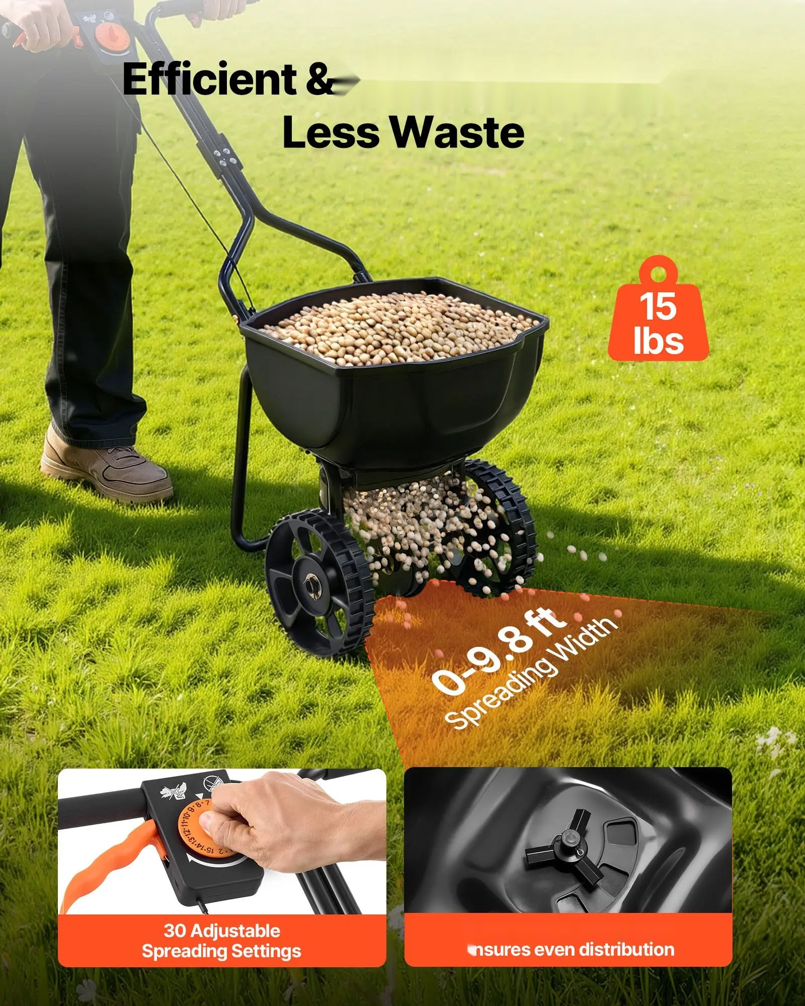 ·Accurate Spreading, Beautiful Lawn: This lawn spreader features 9.8 ft broadcast width and 30-level spreading settings for precise coverage of grass seed and fertilizer. The 15 lbs capacity hopper make it ideal for family use. Easy to push, effortless and efficient spreading, making gardening more enjoyable