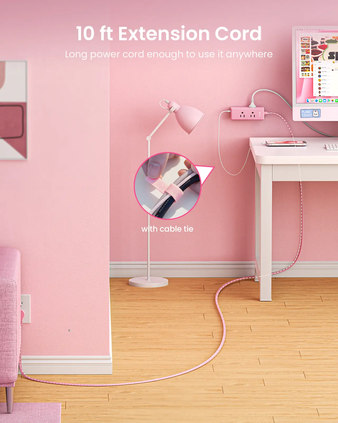 ·10FT Ultra-Flat Pink Extension Cord & Wall Mount:Tuck the 0.11” thin flat extension cord effortlessly behind beds, sofas, or furniture. Includes wall-mount holes for space-saving installation in tight corners. Maximize style + safety in girl’s rooms or under floating desks—zero tripping hazards!
