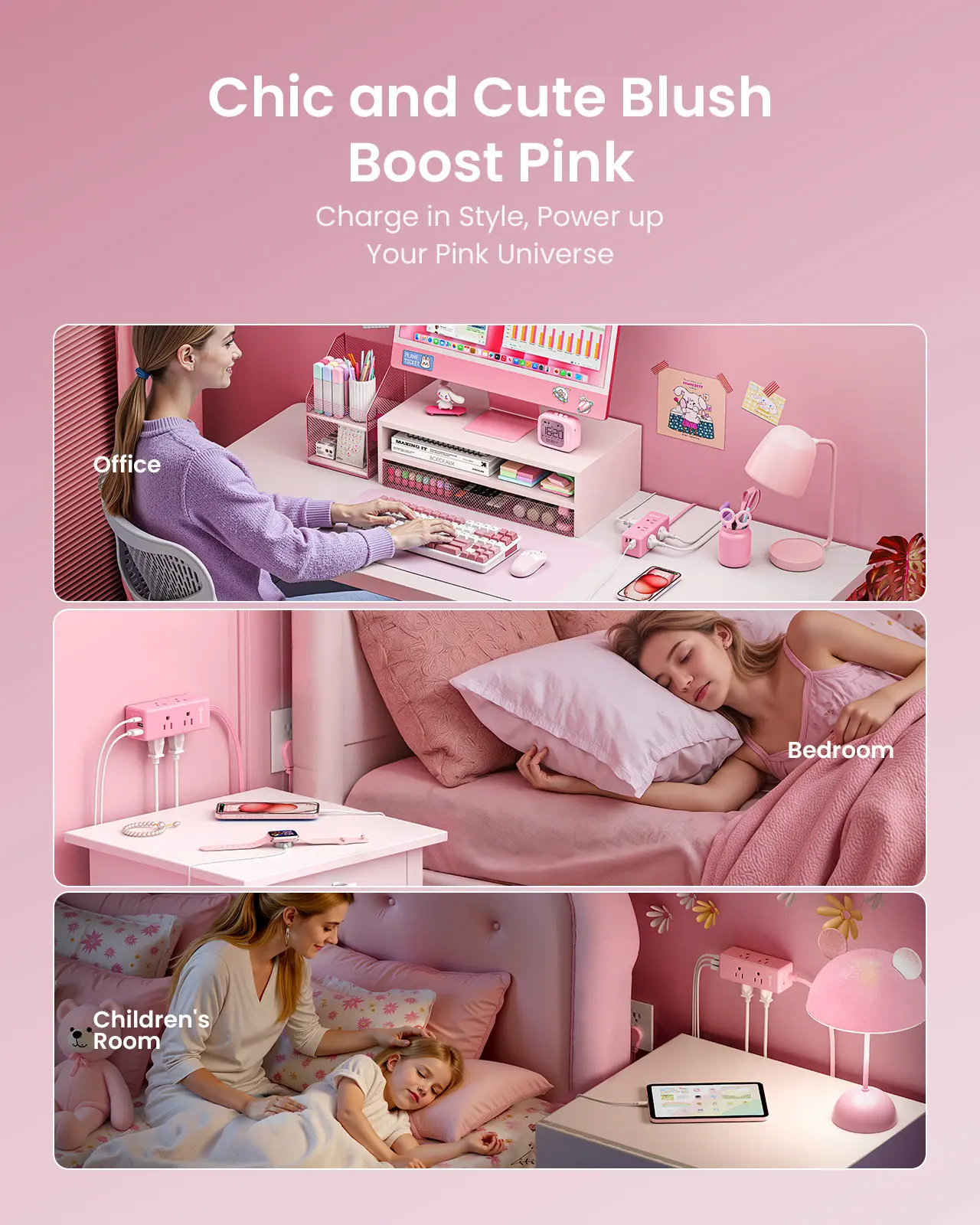 ·Versatile Decor Queen: Bedrooms, Offices, Travel & More!:Ditch dull black power strips! This blush pink power cord doubles as chic decor for vanity tables, home offices, or dorm setups. Fade-resistant pink adds warmth to any space while the USB-C port future-proofs your tech. Bonus: It’s a must-have for women juggling WFH and self-care routines!s/nightstand, home offices, or wedding registries. Bonus:The soft pink color resists fading and makes the space feel cozy, chic, and personalized.A must-have pink desk accessories for girls and woman