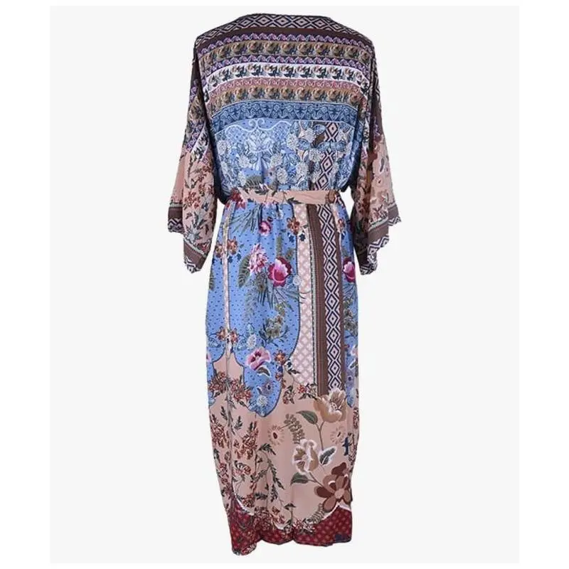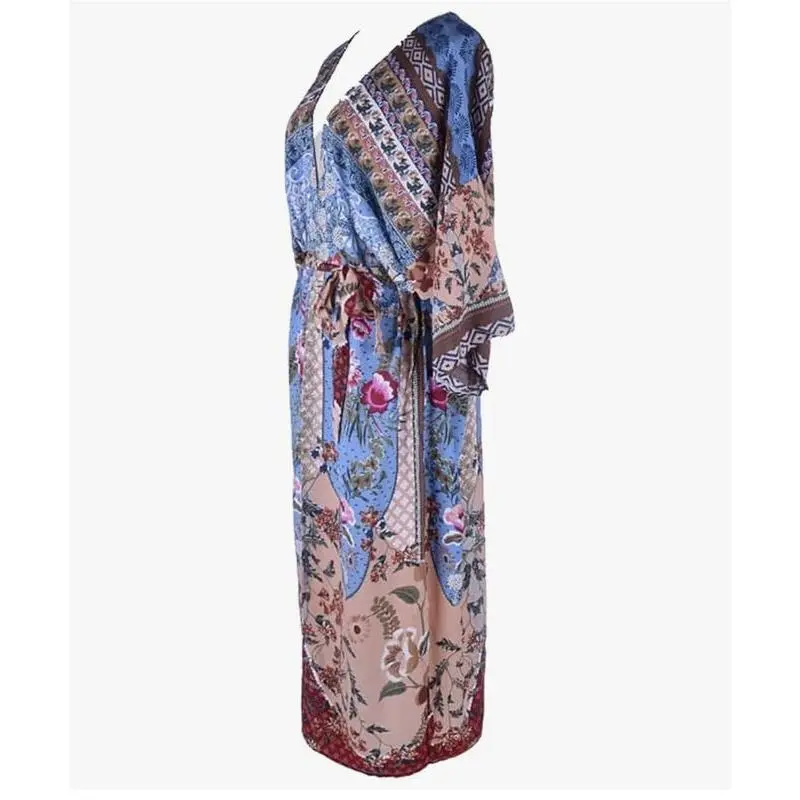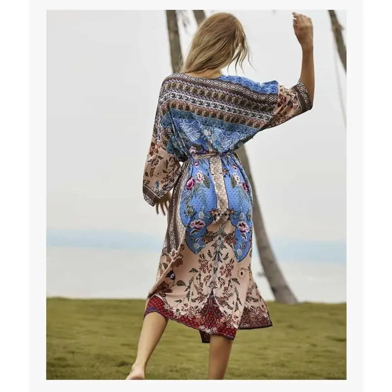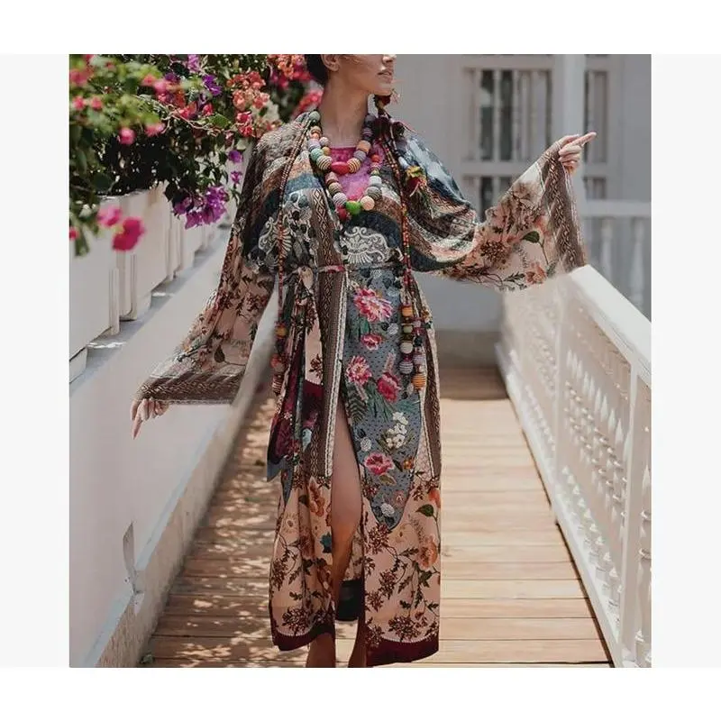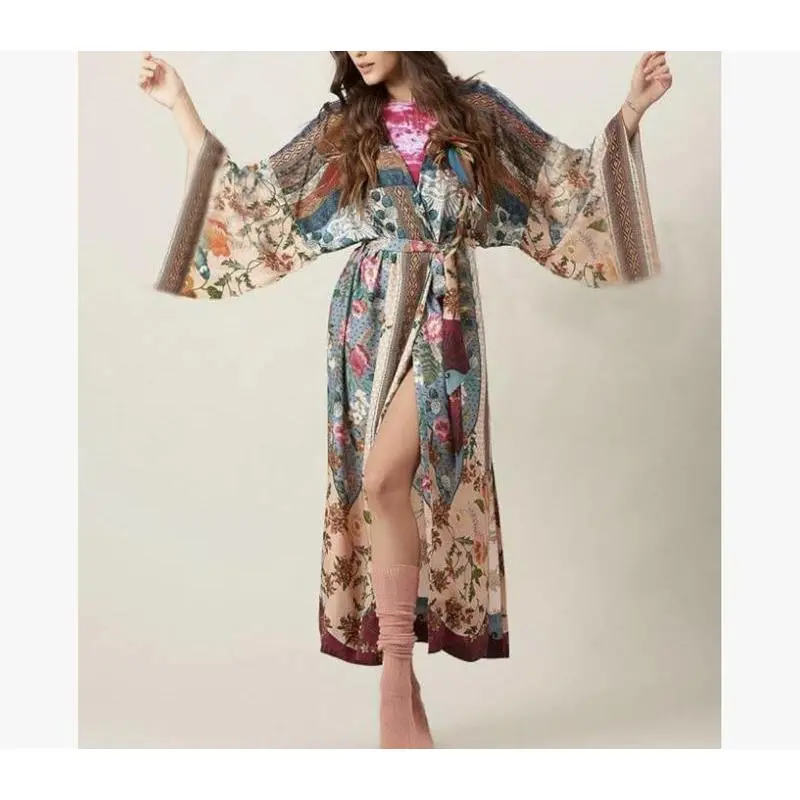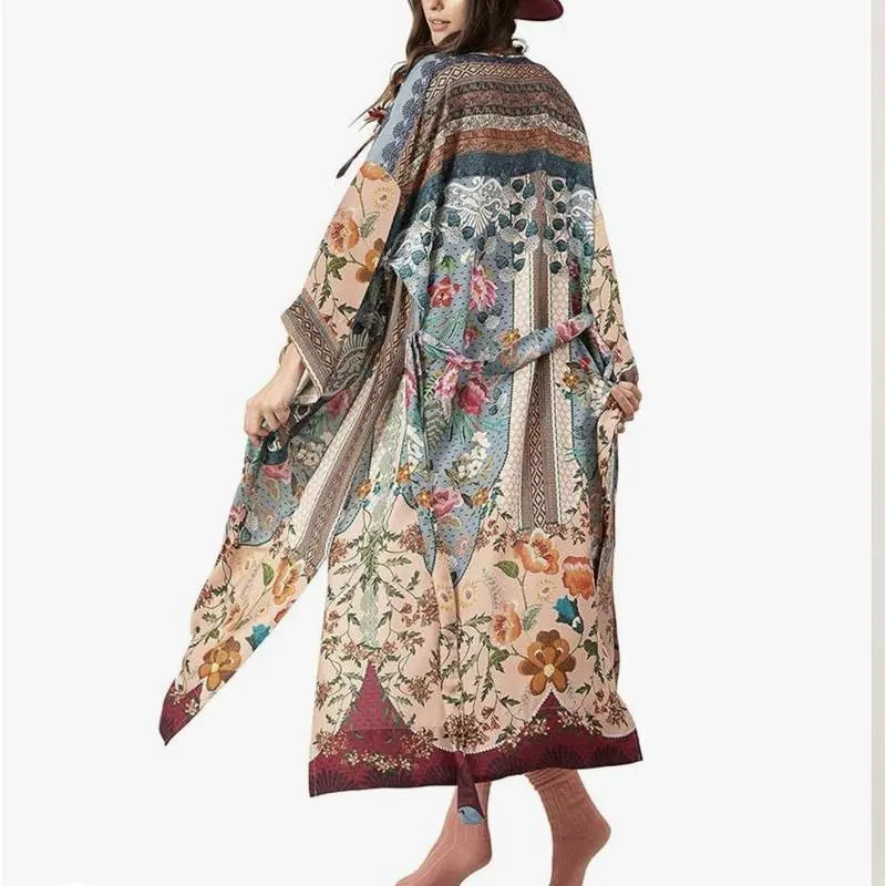 Size(inch): Shoulder:30-31", Sleeve:10-11", Length:50-51" approx. Long sleeve and open front. Lightsome fabric with beautiful print. Suitable for: Party, Daily Wear, Swimming pool, Beach etc. The long loose fit looks more stylish and very flowy. Lightweight and soft comfortable fabric. Care: Gentle wash, hang dry. Collarless; Pull-on style. Short kimono sleeves. Easy fit, Unlined. One size fits most.