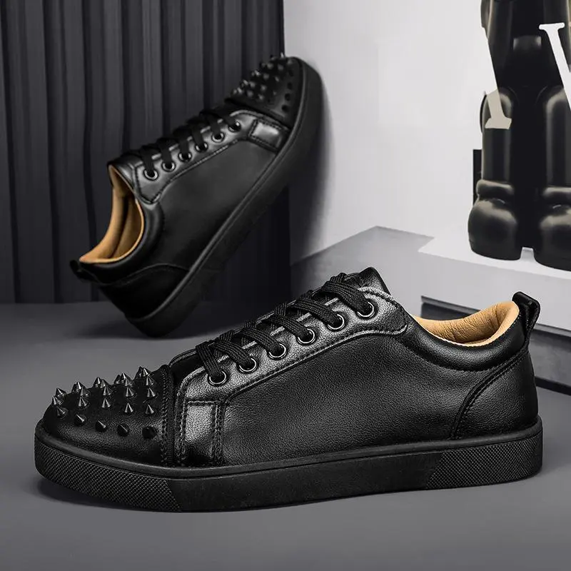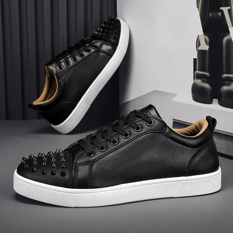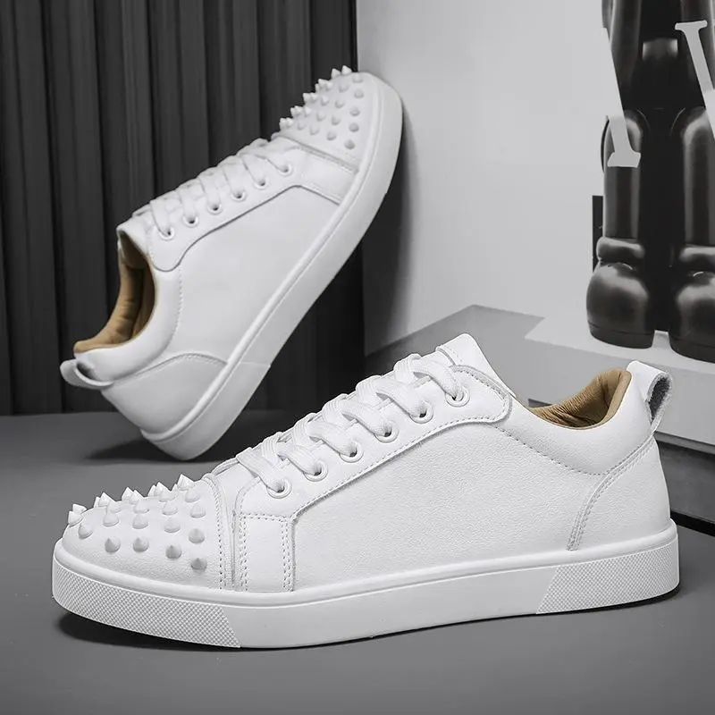 Men'sRedSoleStuddedCasualShoesSimpleSneakersFashionTrendGenuineMicrofiberLeatherShoesWhiteShoes Athletic Closed
