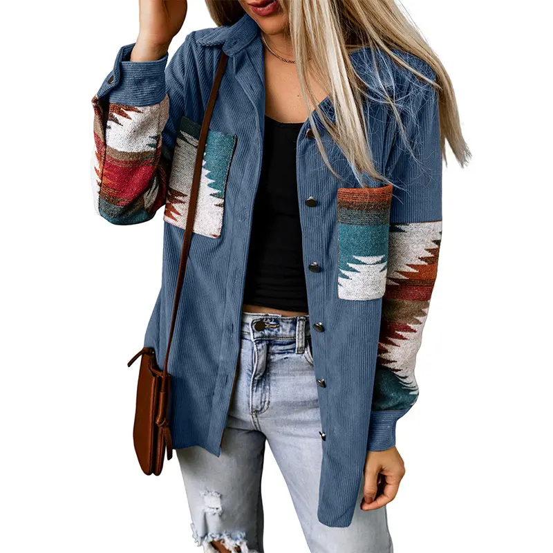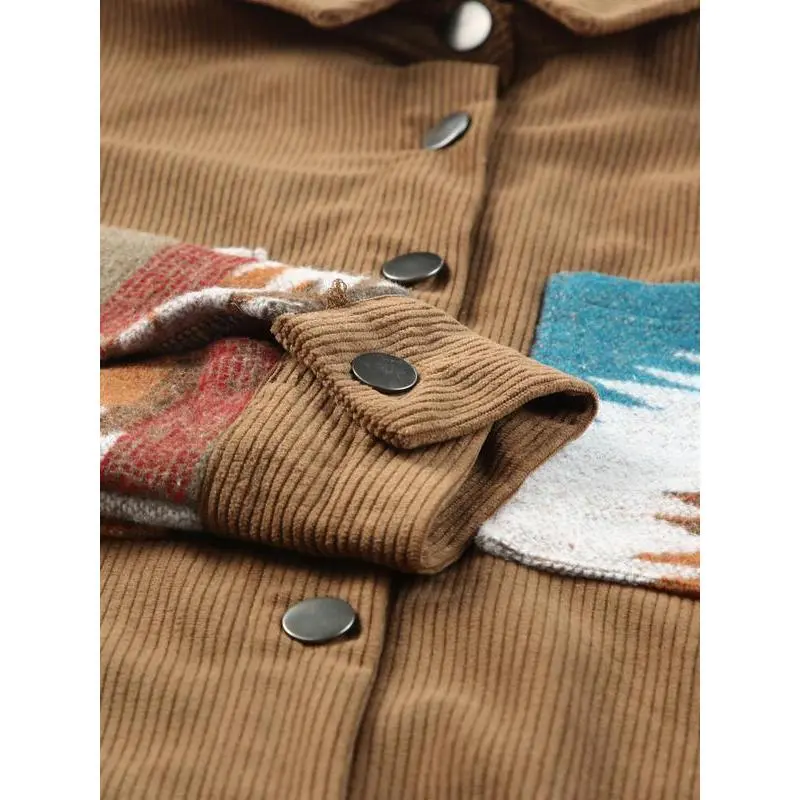 Women's Western Geometric Print Collared Button Front Corduroy Coat, Casual Pocket Long Sleeve Outerwear for Spring & Fall, Ladies Clothes for Daily Wear