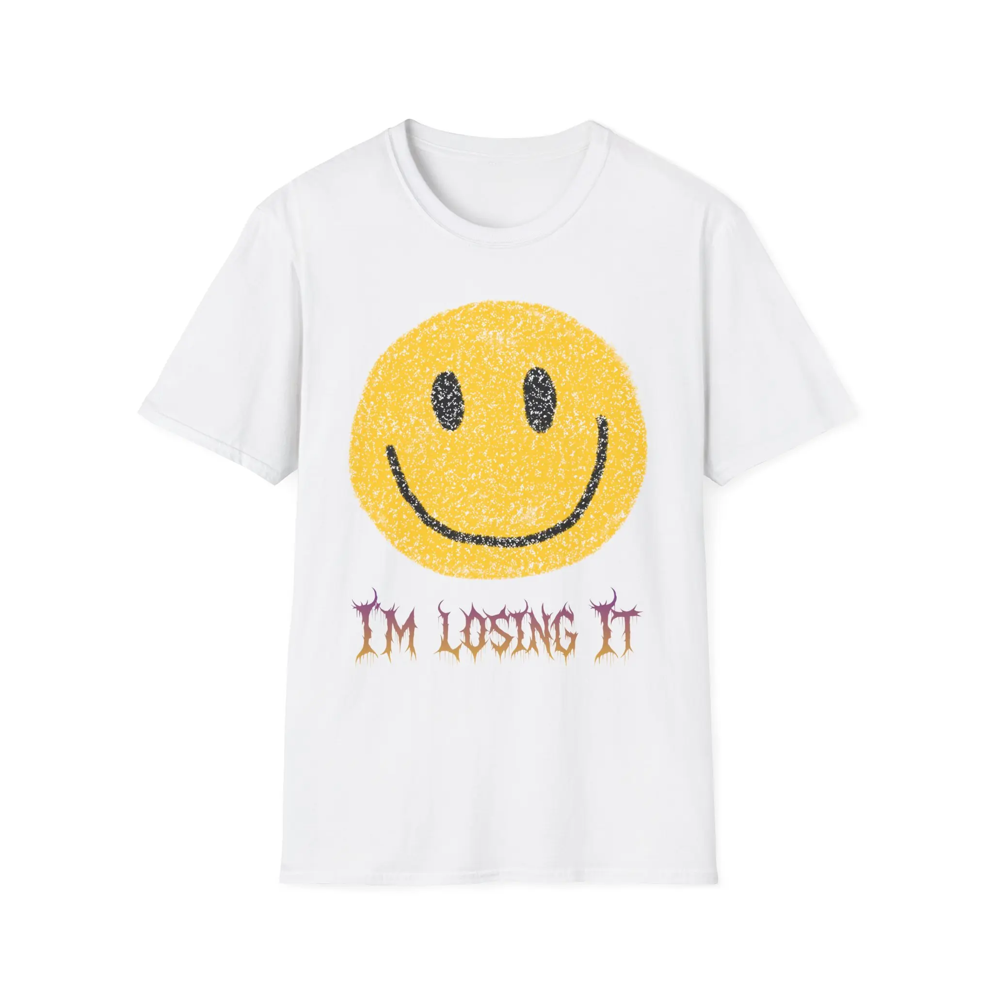 This lightweight crewneck tee brings a wry, slightly chaotic energy to casual days. A distressed yellow smiley sits front-and-center, its grainy texture and worn edges pairing with jagged, gothic lettering that reads “I’m Losing It.” It feels like a late-night laugh with friends, a sardonic shrug at the small disasters of everyday life, or an anthem for anyone who meets stress with humor. The soft ring-spun cotton and clean classic fit let the design take the spotlight while staying comfortable for all-day wear. Wear it layered under a jacket or alone with jeans — it reads like a mood, not just a shirt.